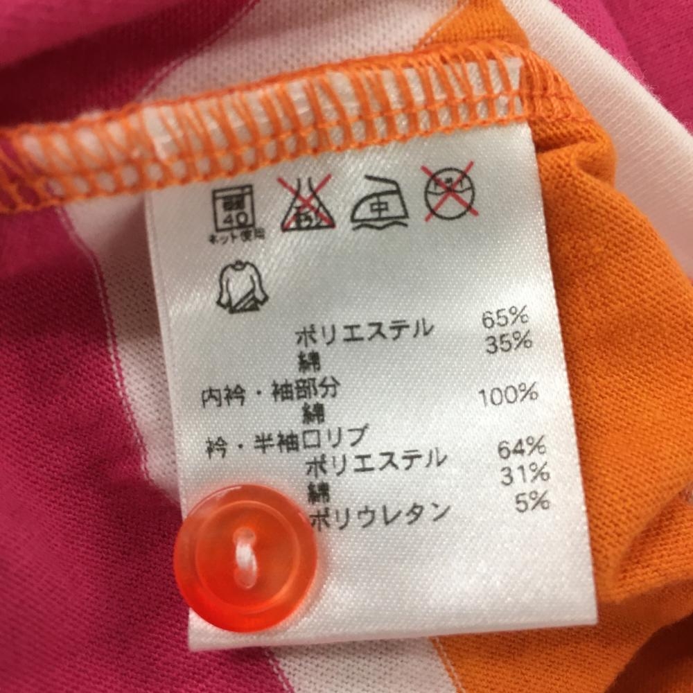 【美品】フィラゴルフ 長袖ポロシャツ オレンジ×ピンク ボーダー柄 ロゴプリント 二重襟 重ね着風 レディース M ゴルフウェア FILA GOLF