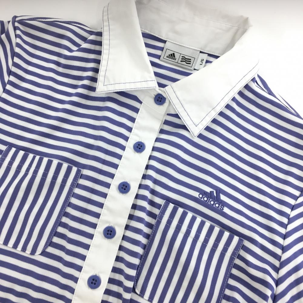 【美品】アディダス 半袖ポロシャツ 白×パープル ボーダー 総柄 胸ポケット レディース L/G ゴルフウェア adidas