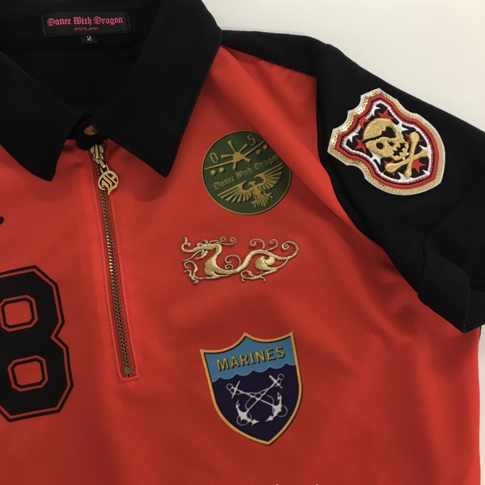ダンスウィズドラゴン 半袖ポロシャツ レッド×黒 ハーフジップ 複数ワッペン風 レディース 2(M) ゴルフウェア Dance With Dragon