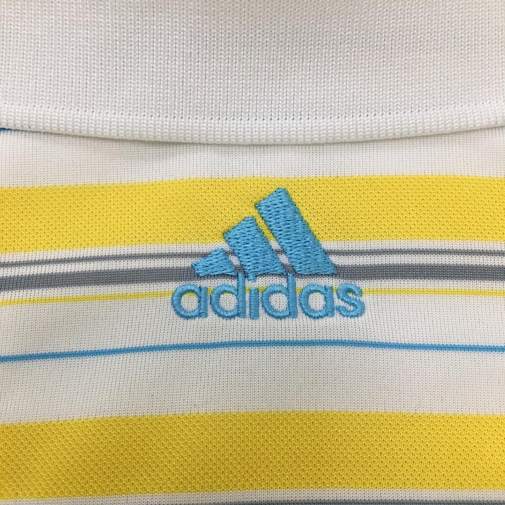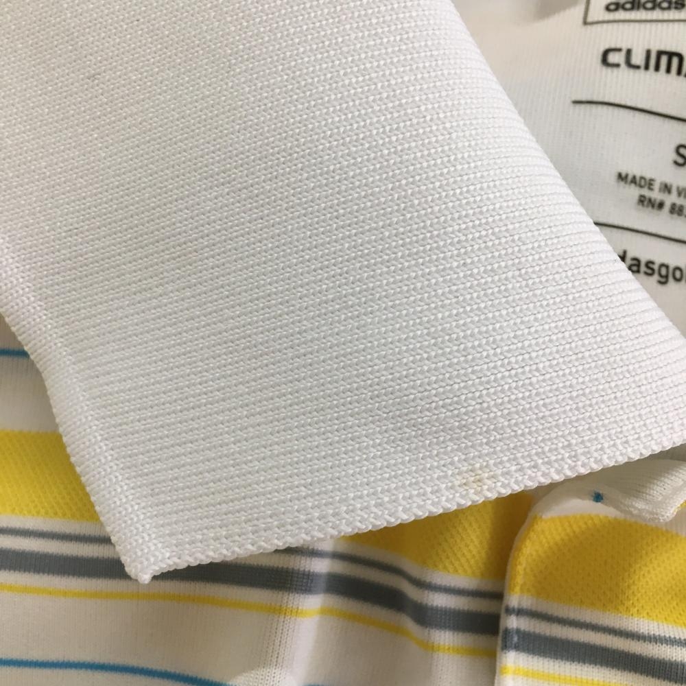 【美品】アディダス 半袖ポロシャツ 白×イエロー ランダムボーダー 胸元刺しゅう メンズ S ゴルフウェア adidas