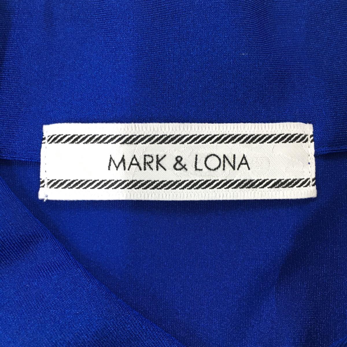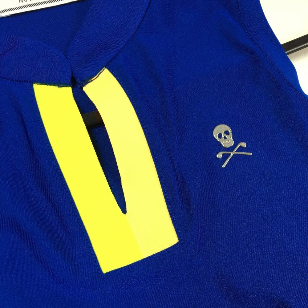 【超美品】マークアンドロナ ノースリーブシャツ ブルー×イエロー ストレッチ スキッパー スカル レディース S ゴルフウェア MARK&LONA