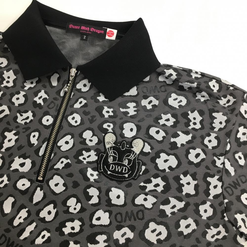 【美品】ダンスウィズドラゴン 半袖ポロシャツ グレー×黒 レオパード ハーフジップ レディース 2(M) ゴルフウェア Dance With Dragon
