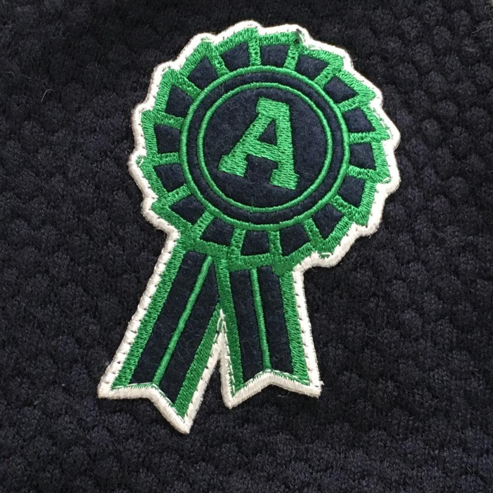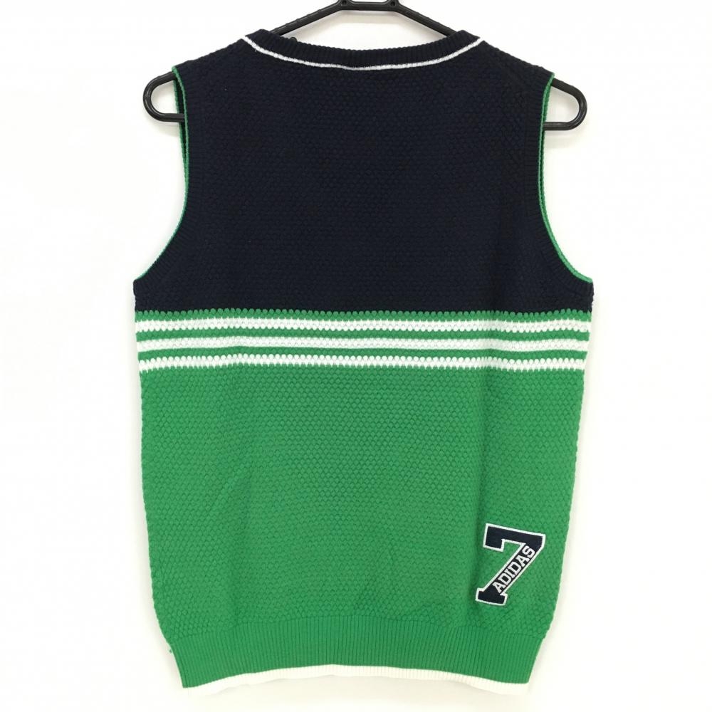 【超美品】アディダス ニットベスト グリーン×ネイビー ウール混 Vネック 勲章ワッペン レディース L/G ゴルフウェア adidas