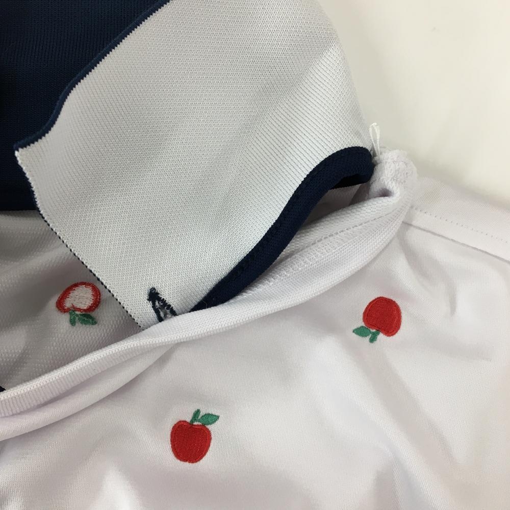 マリクレールスポール 襟付き半袖シャツ 白×ネイビー リンゴ柄 襟着脱可 レディース L ゴルフウェア marie claire