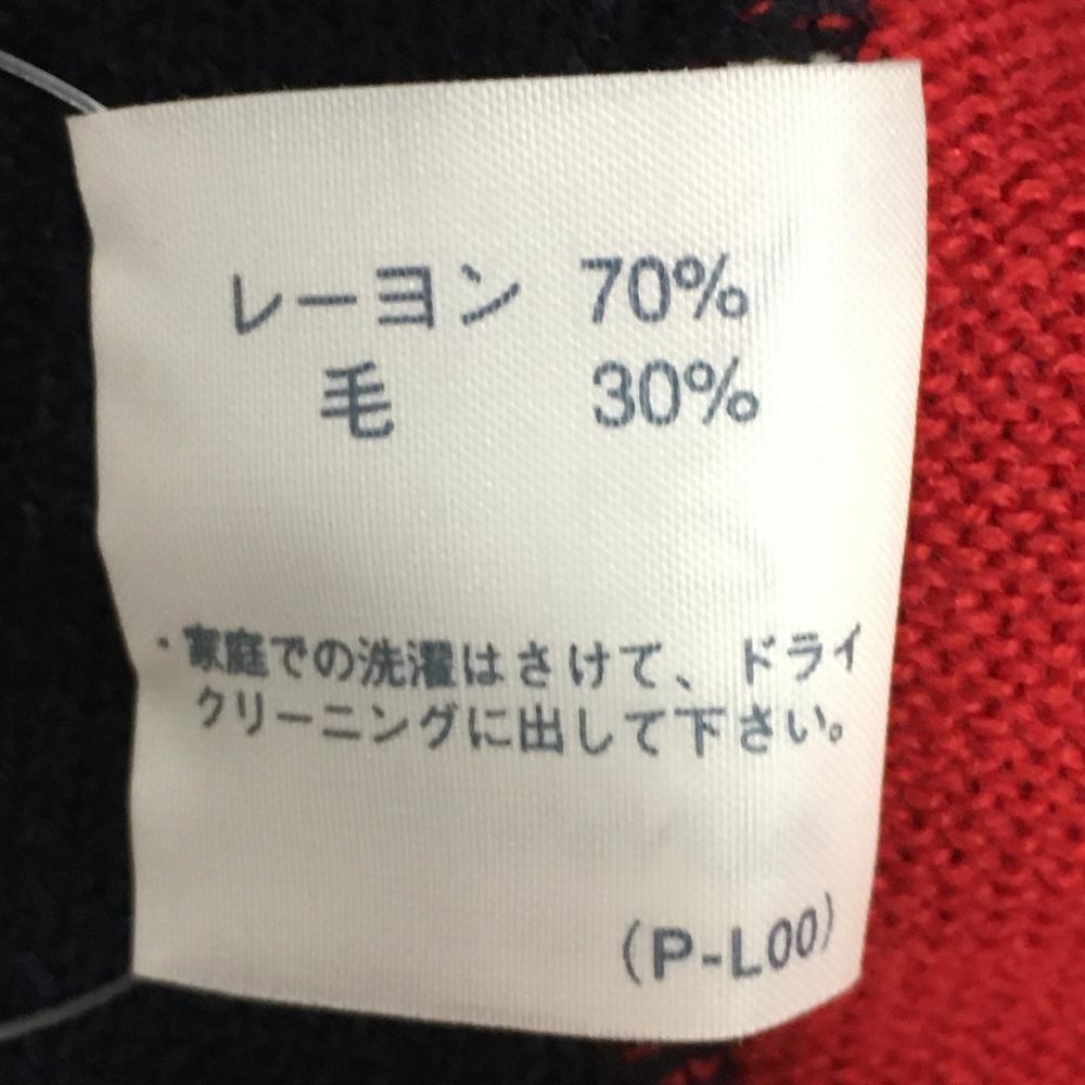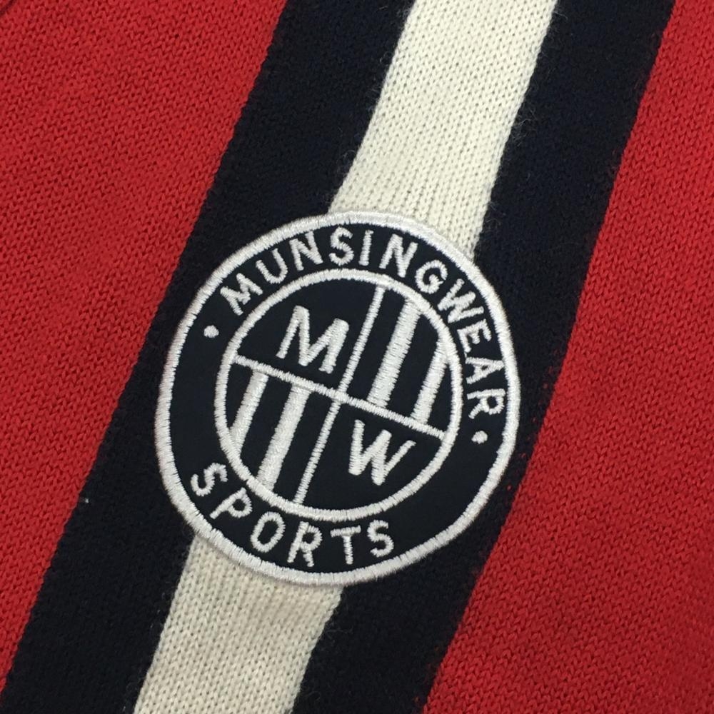 【美品】マンシングウェア ニットベスト レッド×白 ストライプ ロゴワッペン ウール混 レディース M ゴルフウェア Munsingwear