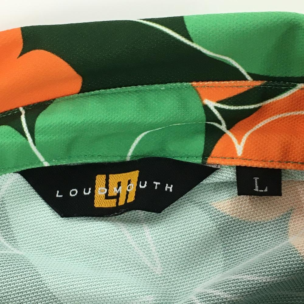 【超美品】ラウドマウス 半袖ポロシャツ グリーン×オレンジ ラッキーオレンジ柄 ロゴ刺しゅう レディース L ゴルフウェア LOUDMOUTH