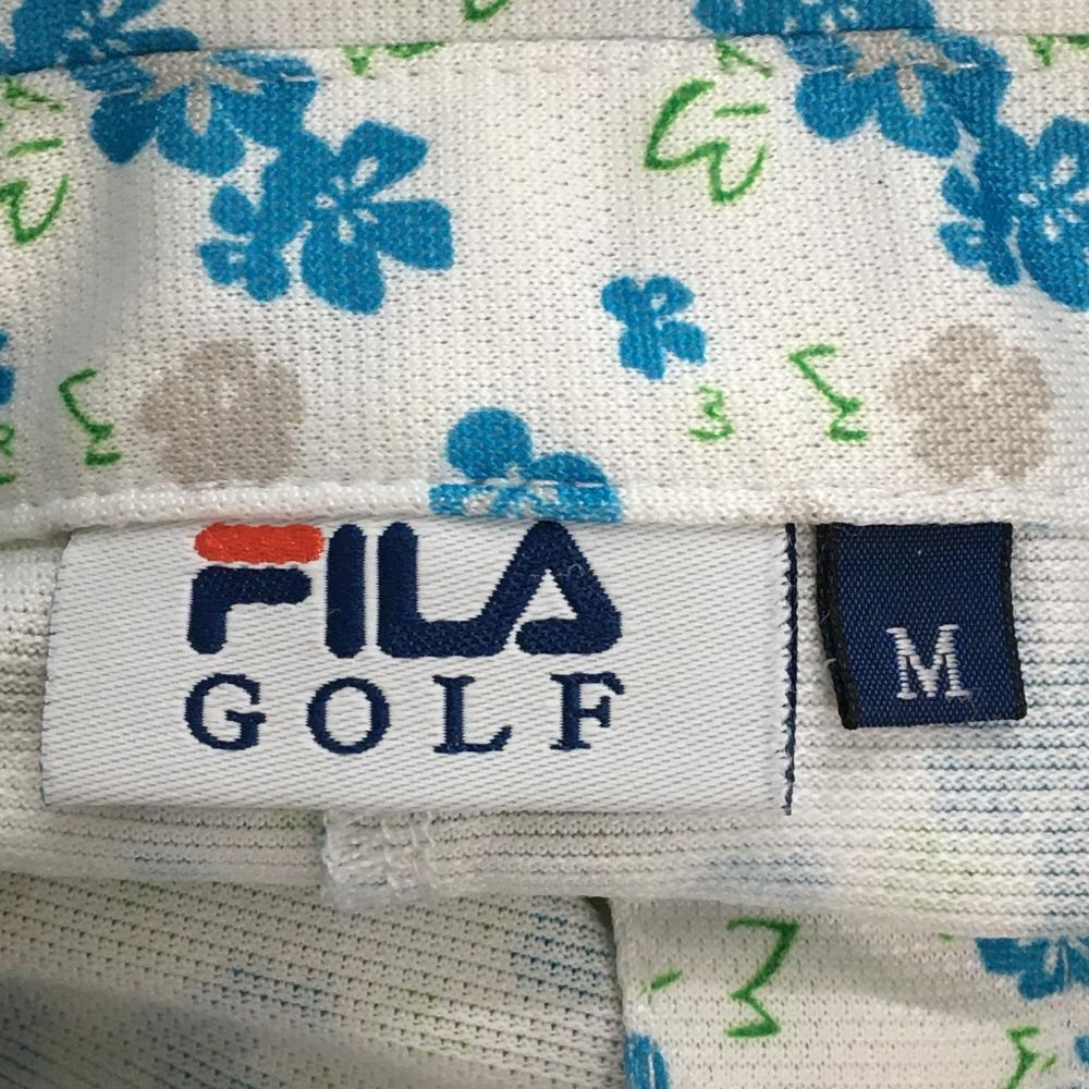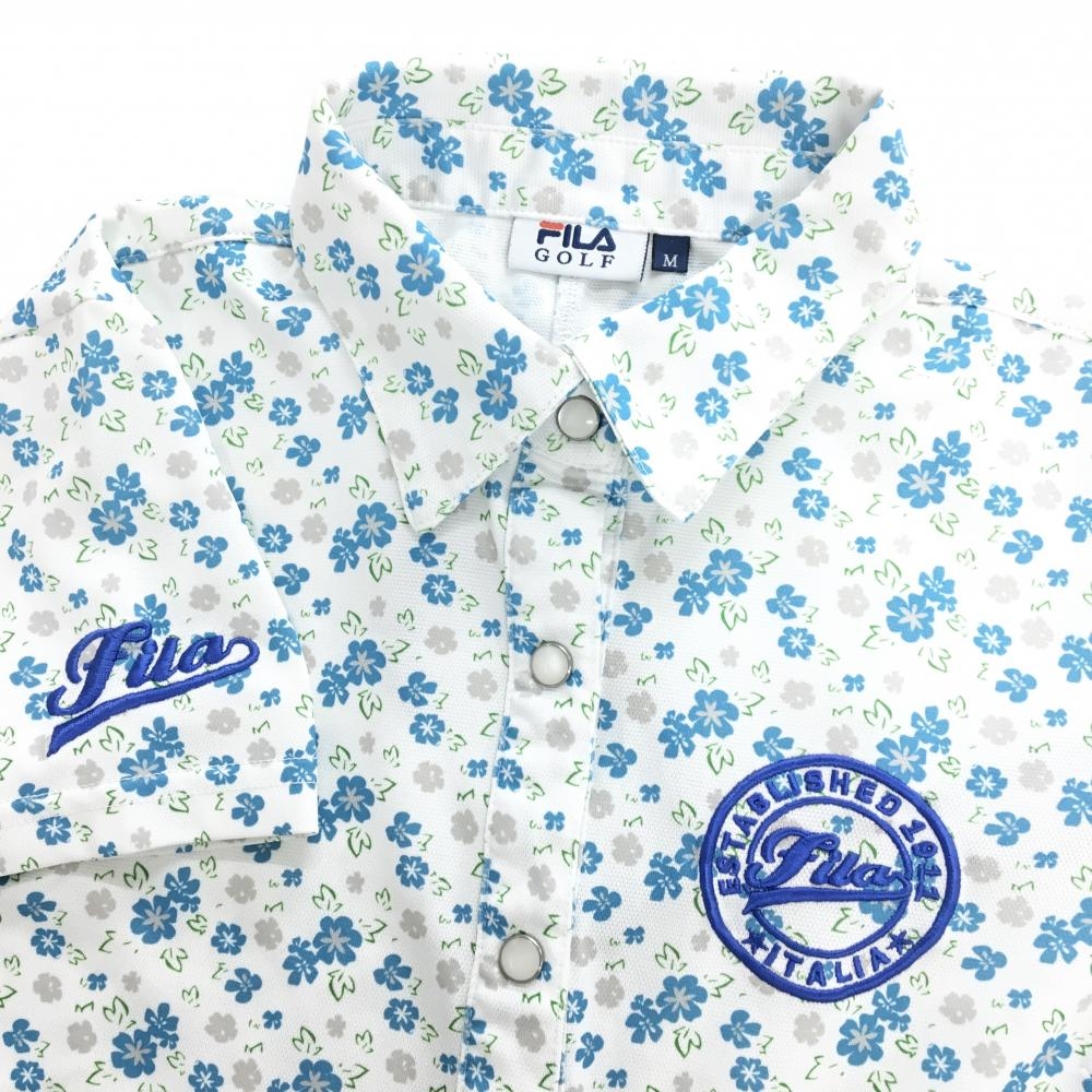 フィラゴルフ 半袖ポロワンピース 白×ブルー 花柄 ロゴ刺しゅう スナップボタン レディース M ゴルフウェア FILA GOLF