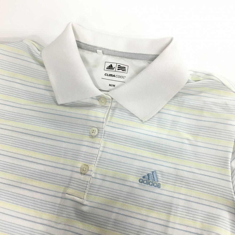 【美品】アディダス 半袖ポロシャツ 白×ライトブルー ボーダー CLIMACOL レディース M/M ゴルフウェア adidas