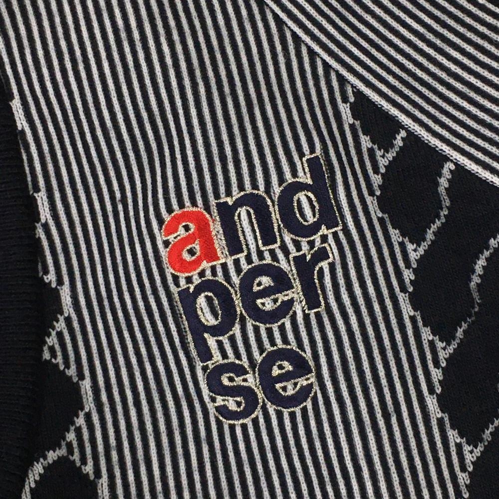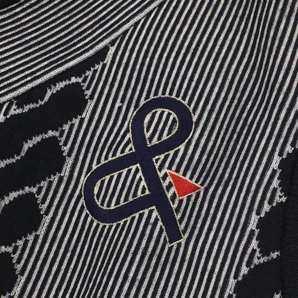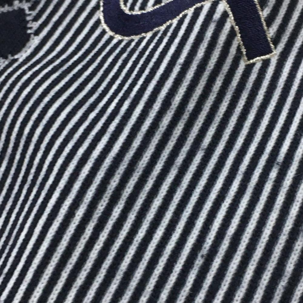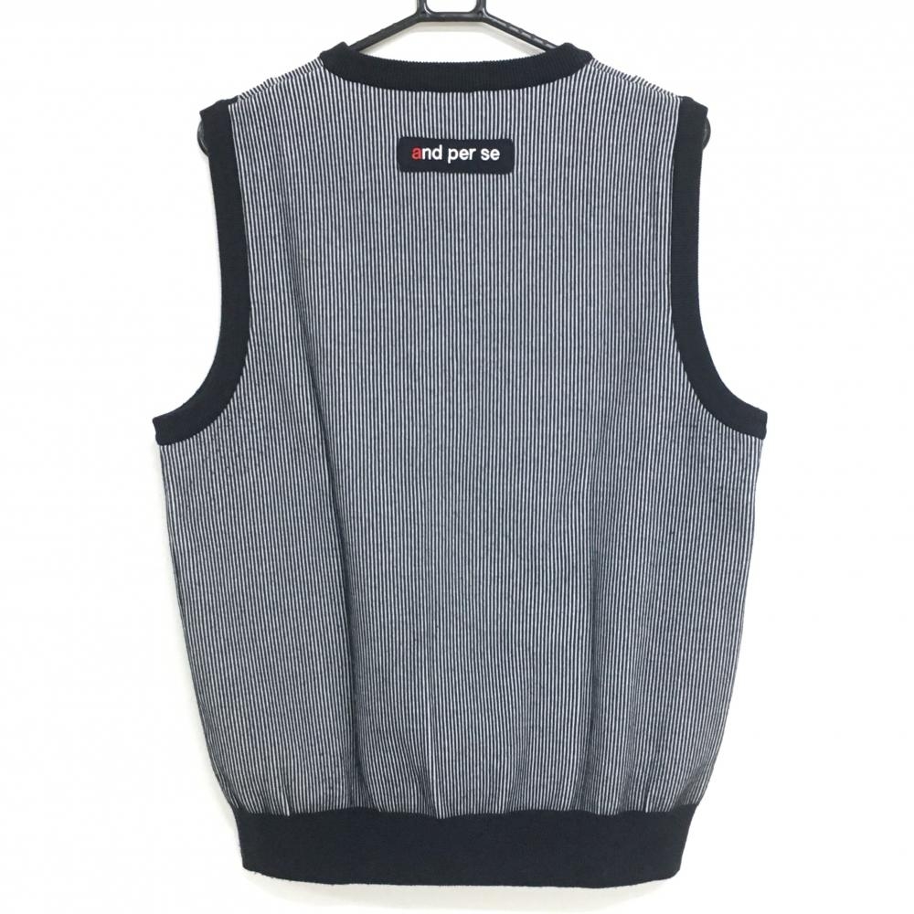 【美品】アンパスィ ニットベスト ネイビー×白 細ストライプ 前面一部ケーブル編み ウール混 Vネック メンズ LL ゴルフウェア and per se