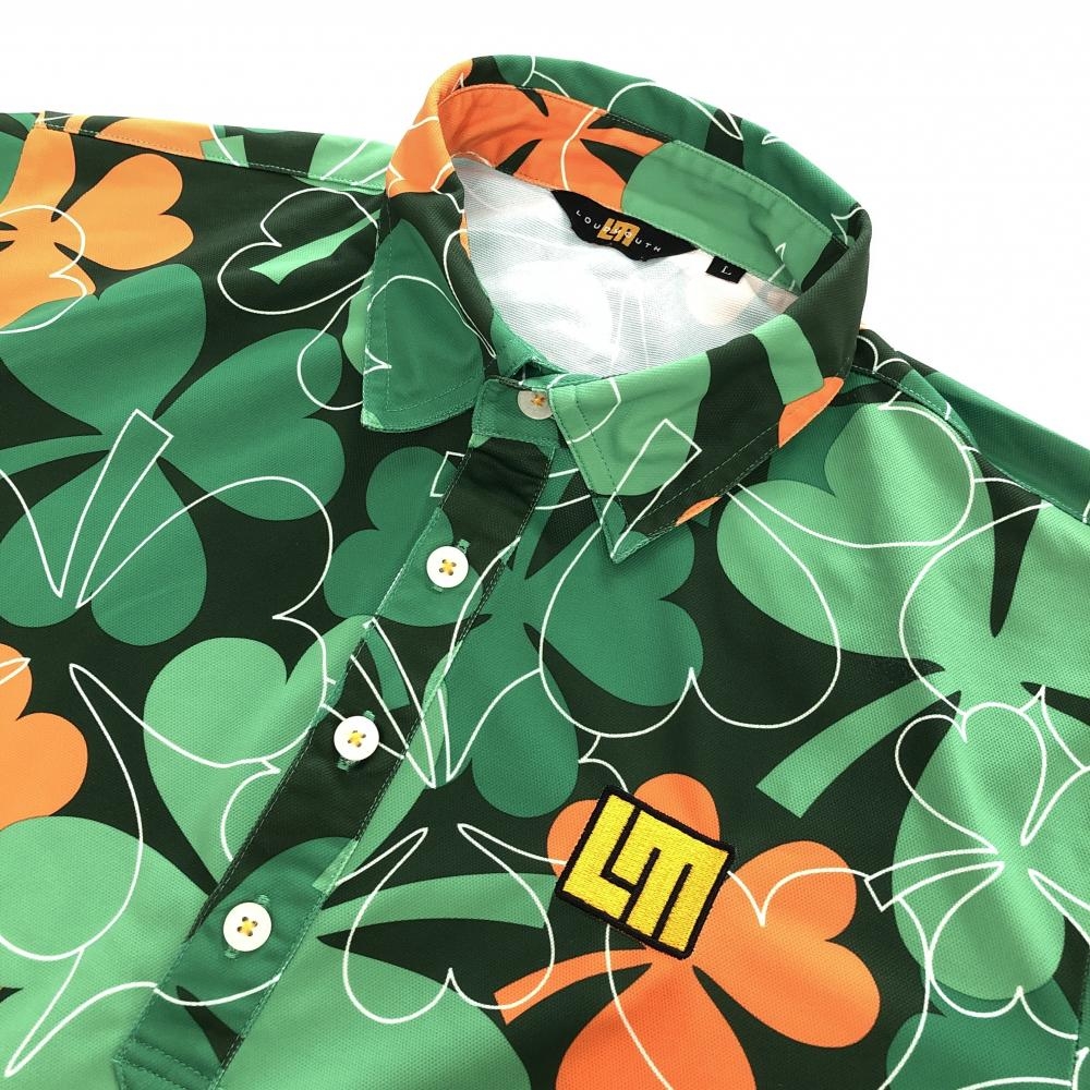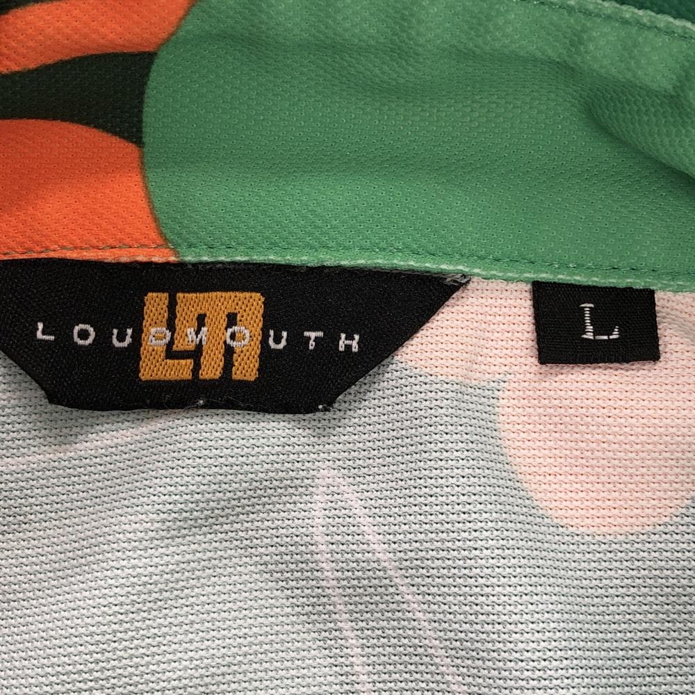 【美品】ラウドマウス 半袖ポロシャツ グリーン×オレンジ クローバー総柄 ラッキーオレンジ メンズ L ゴルフウェア LOUDMOUTH