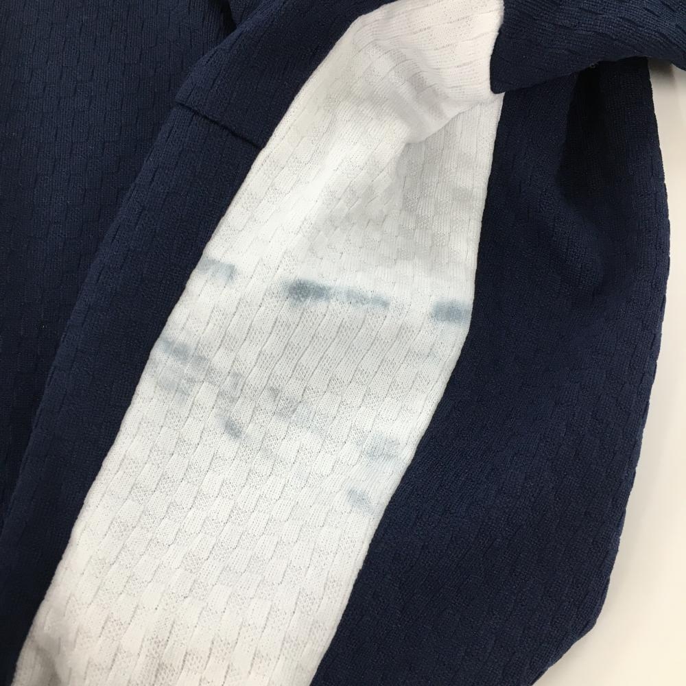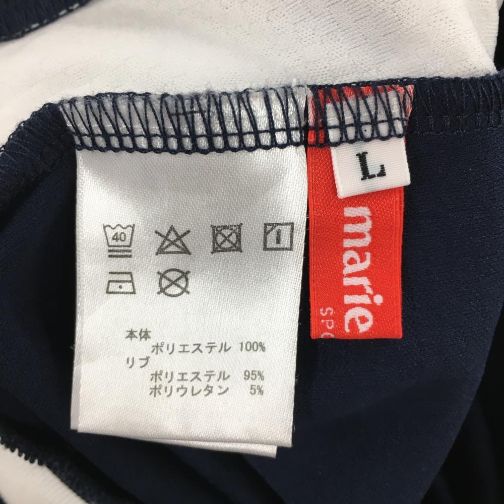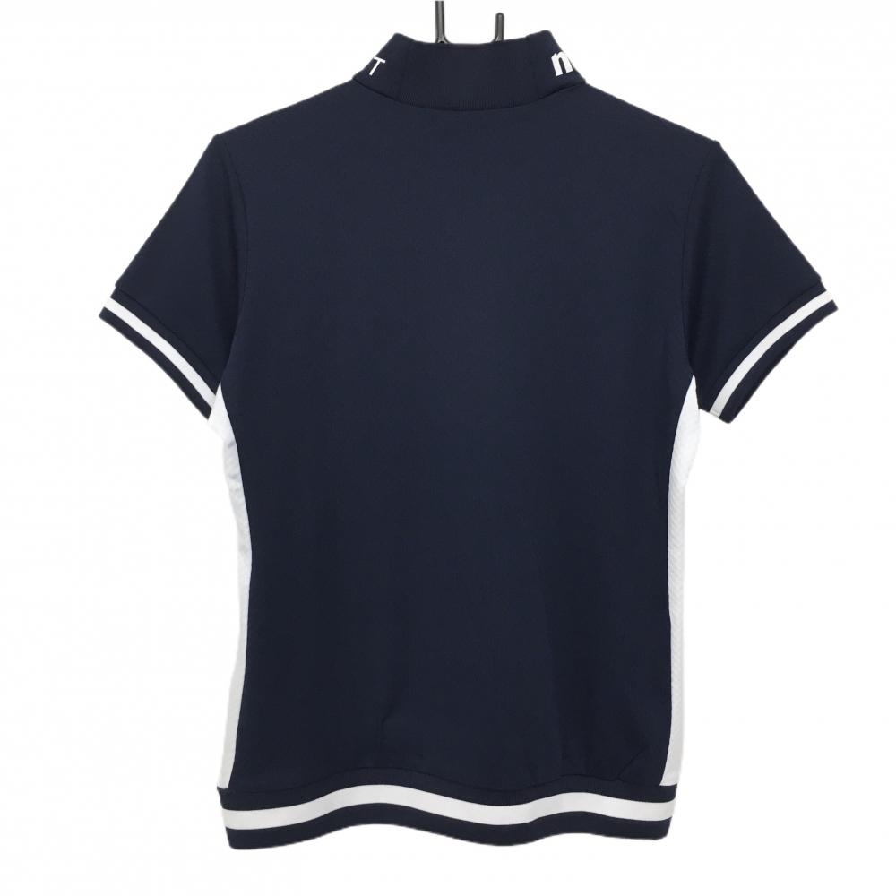 【美品】マリクレールスポール 半袖ハイネックシャツ ネイビー×白 ネックロゴプリント 地模様 レディース L ゴルフウェア marie claire