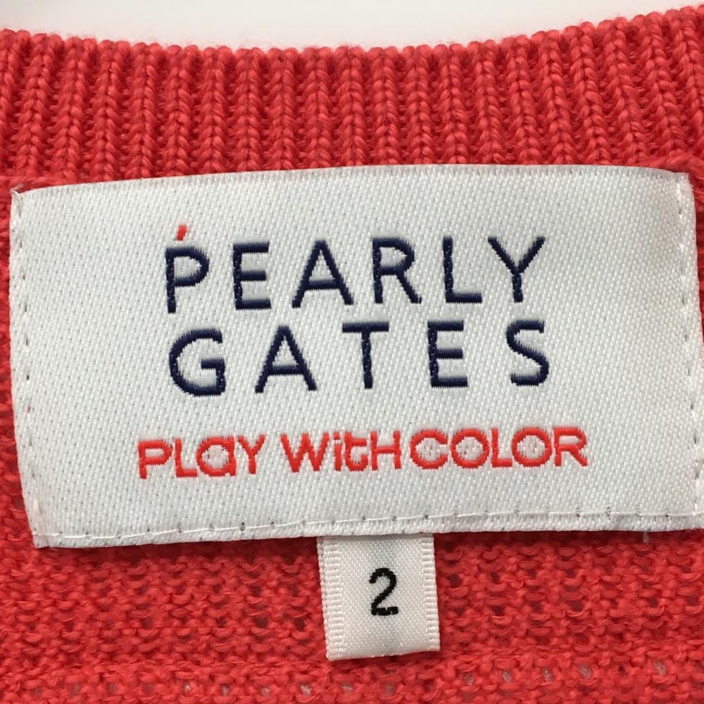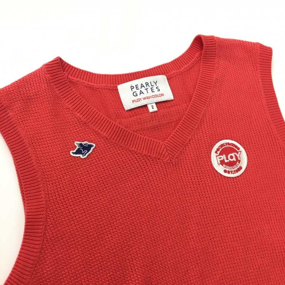 【美品】パーリーゲイツ ニットベスト レッド系 コットン100% ワッペン Vネック レディース 2(L) ゴルフウェア PEARLY GATES
