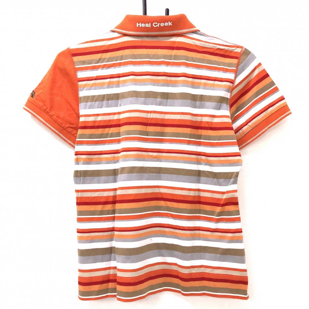 【超美品】ヒールクリーク 半袖ポロシャツ オレンジ×白 ボーダー レディース 40(M) ゴルフウェア Heal Creek