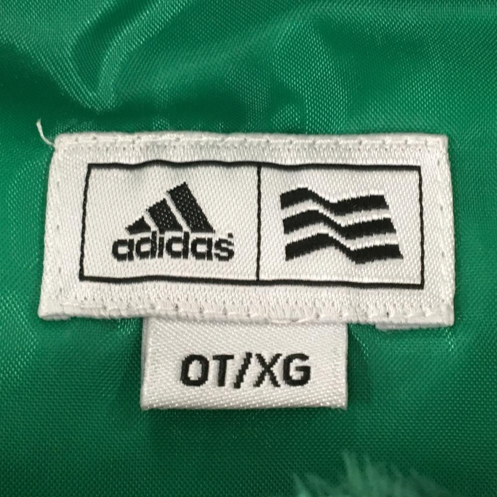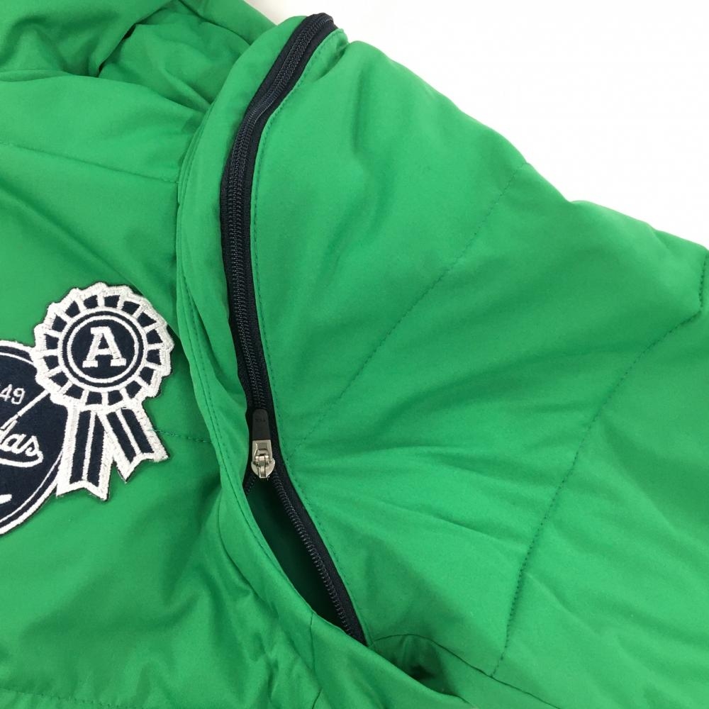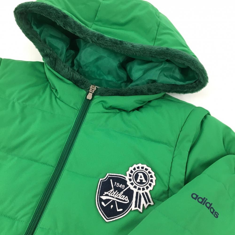 【超美品】アディダス 2WAY中綿ジャケット グリーン 袖着脱可 フード付 ワッペン レディース OT/XG ゴルフウェア adidas