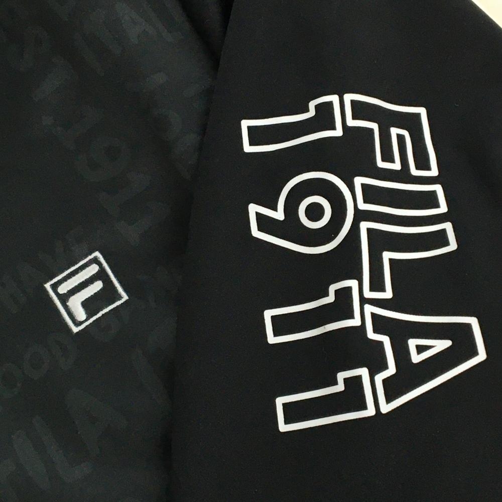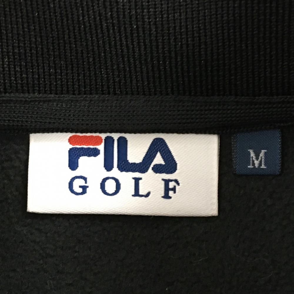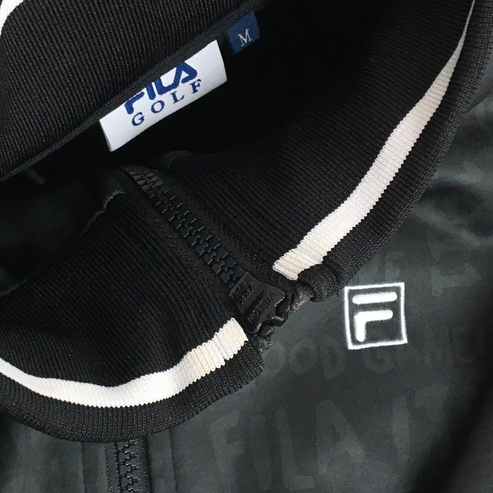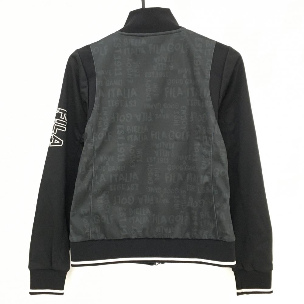【美品】フィラゴルフ ジャケットブルゾン 黒 身頃英字総柄 ロゴ白 裏微起毛 レディース M ゴルフウェア FILA GOLF