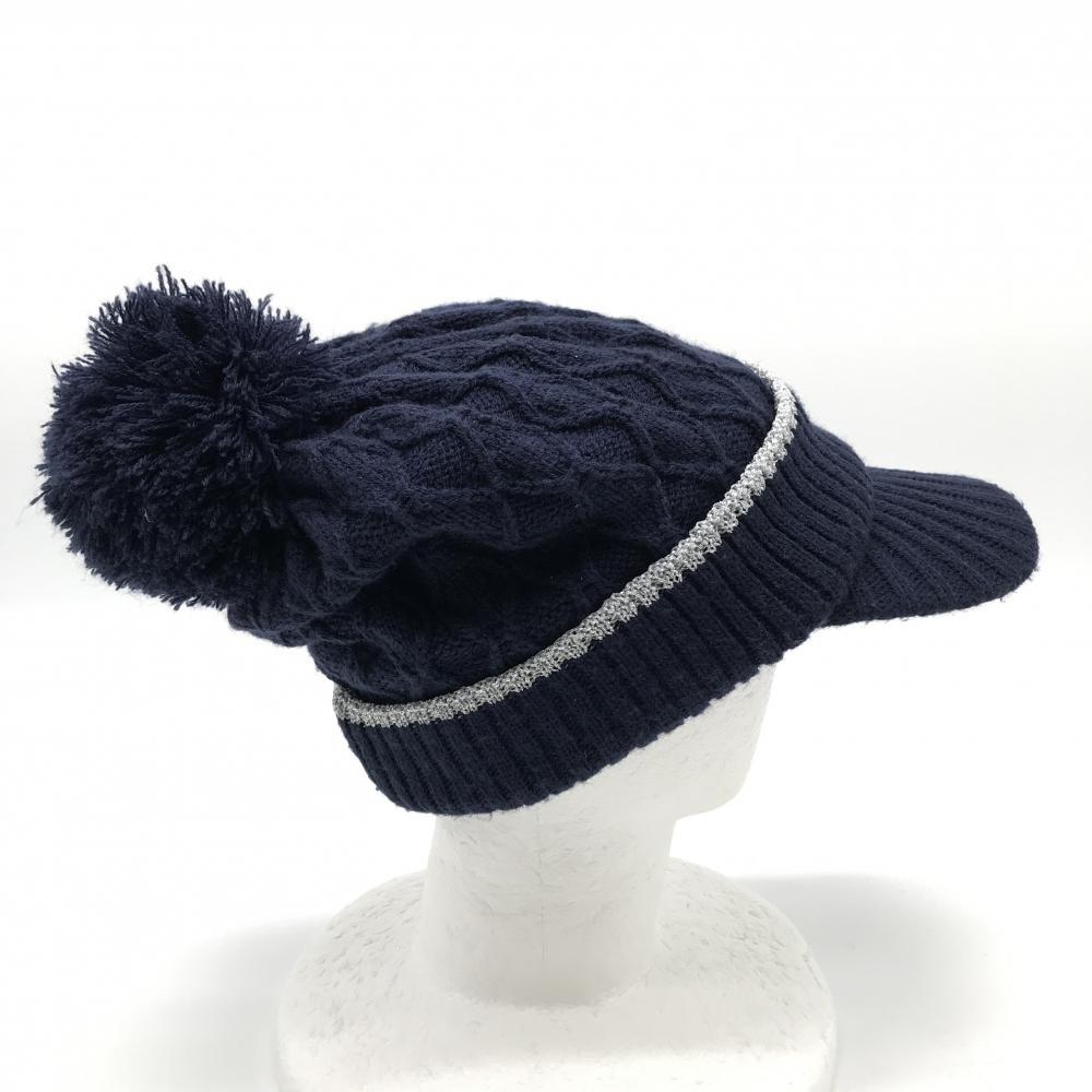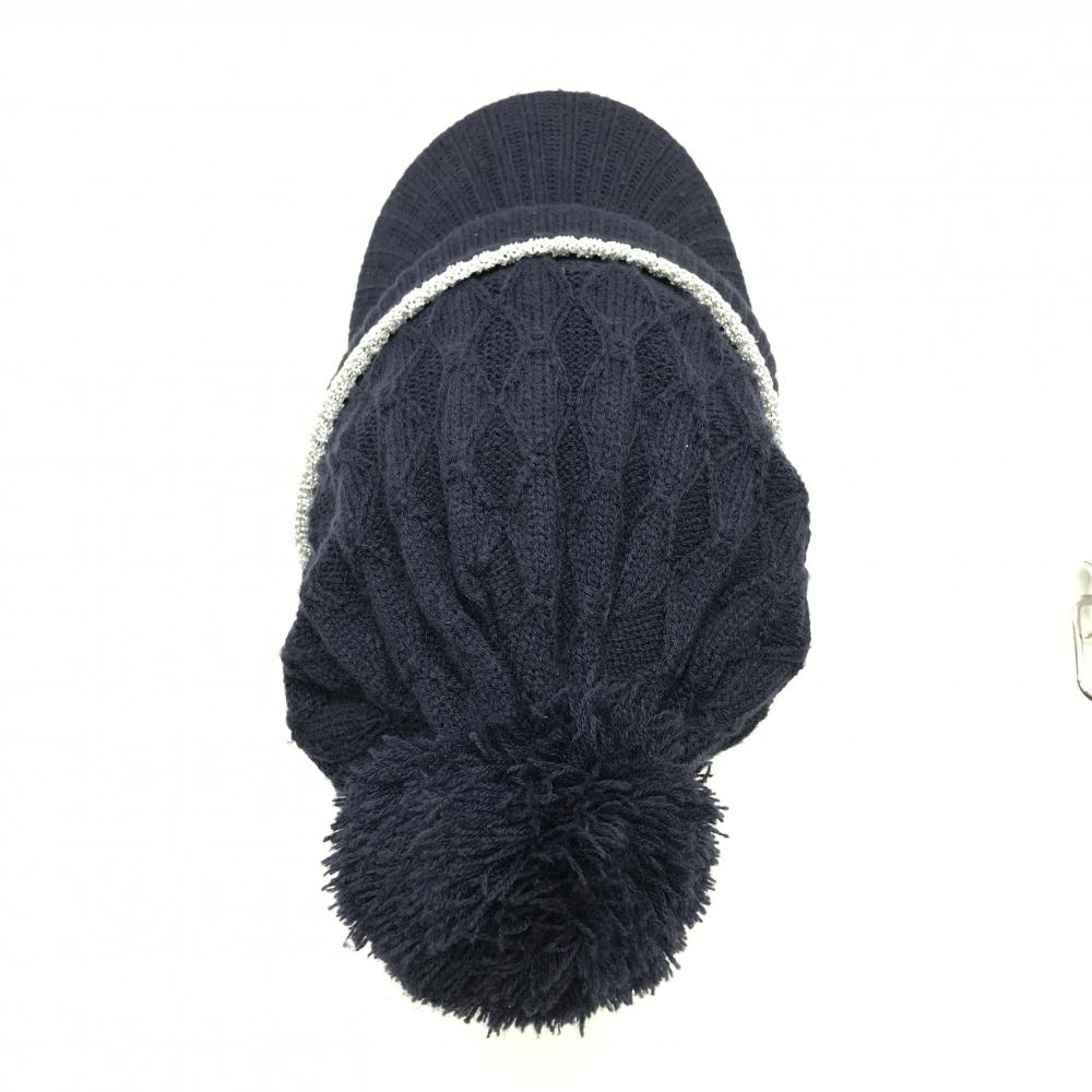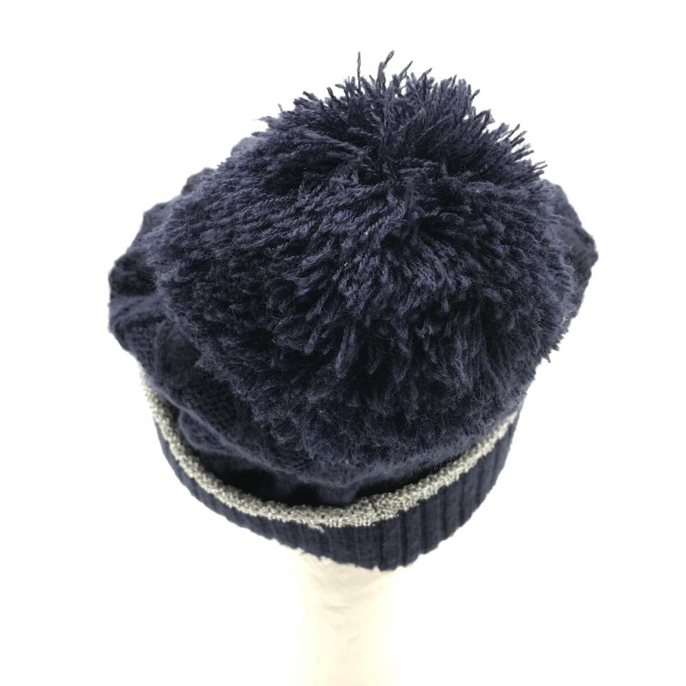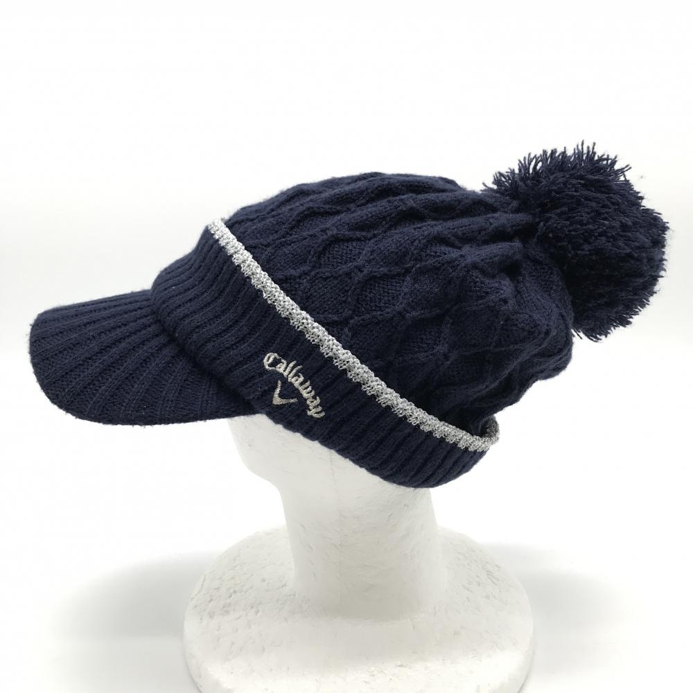 【美品】キャロウェイ つば付きニット帽 ネイビー×シルバー ボンボン付き FR ゴルフウェア Callaway