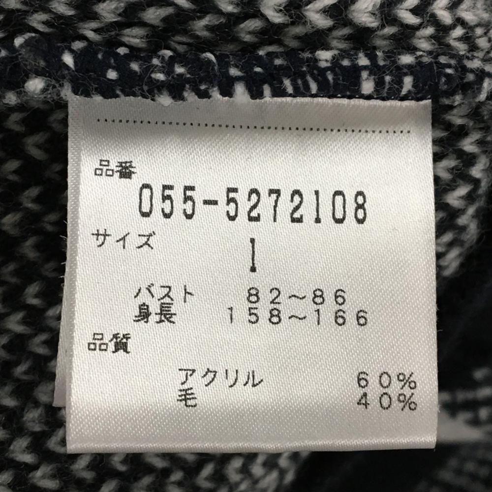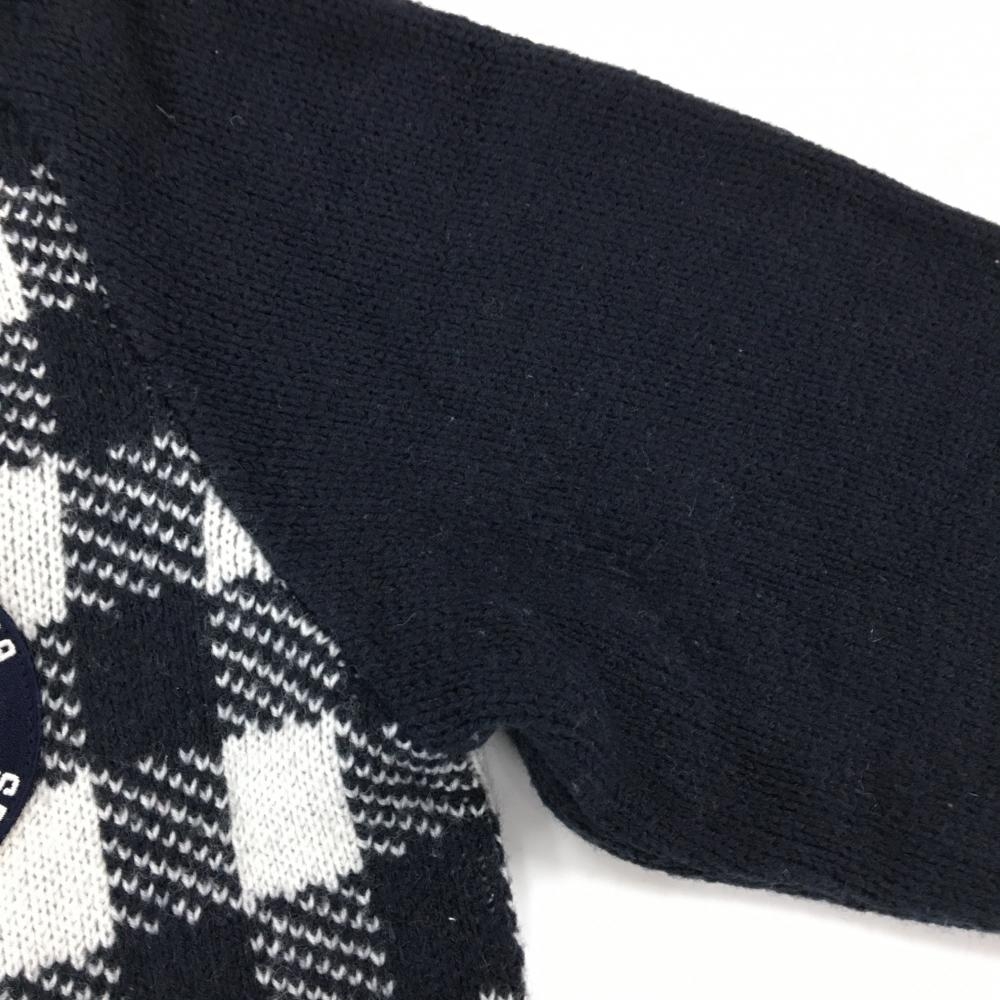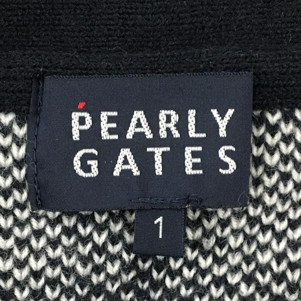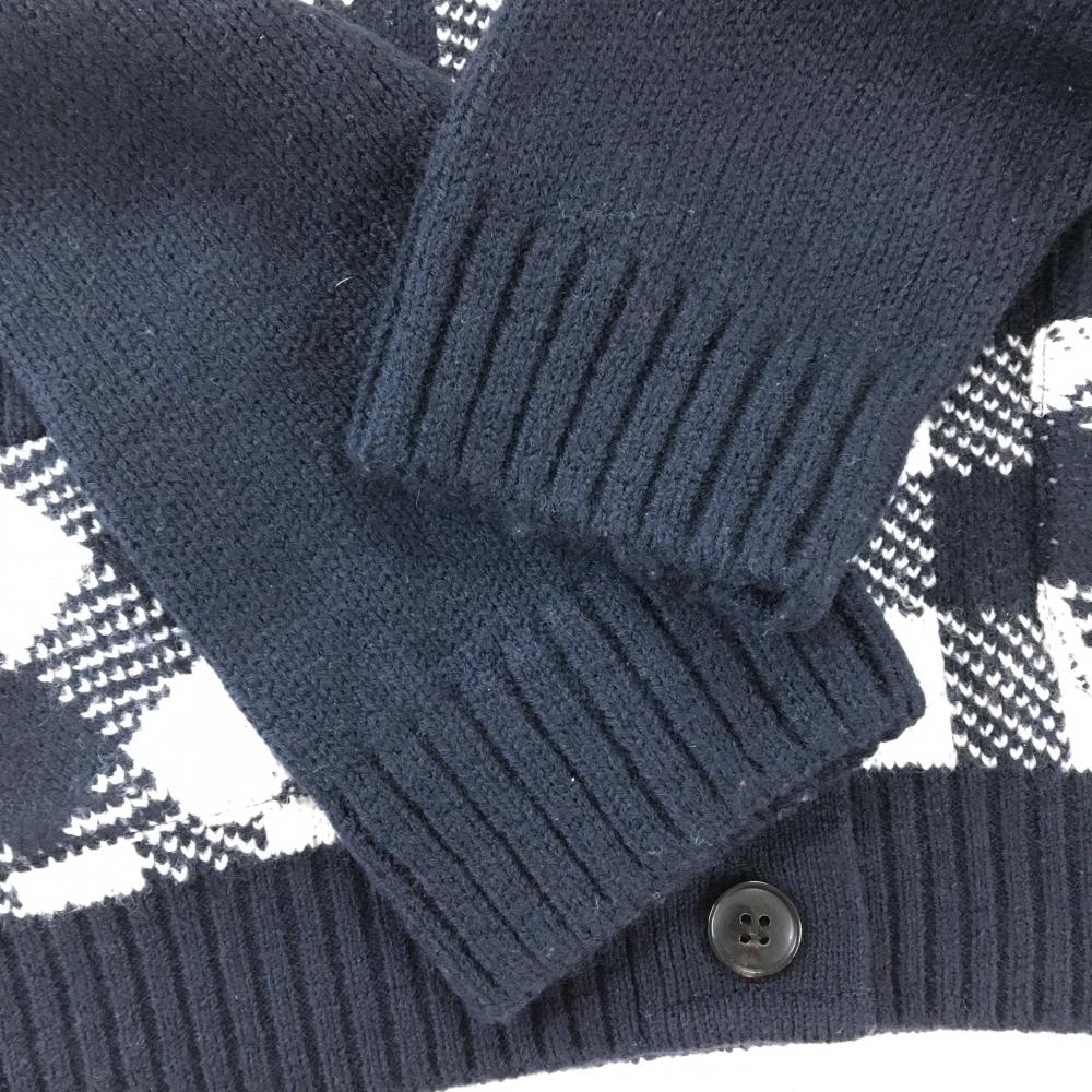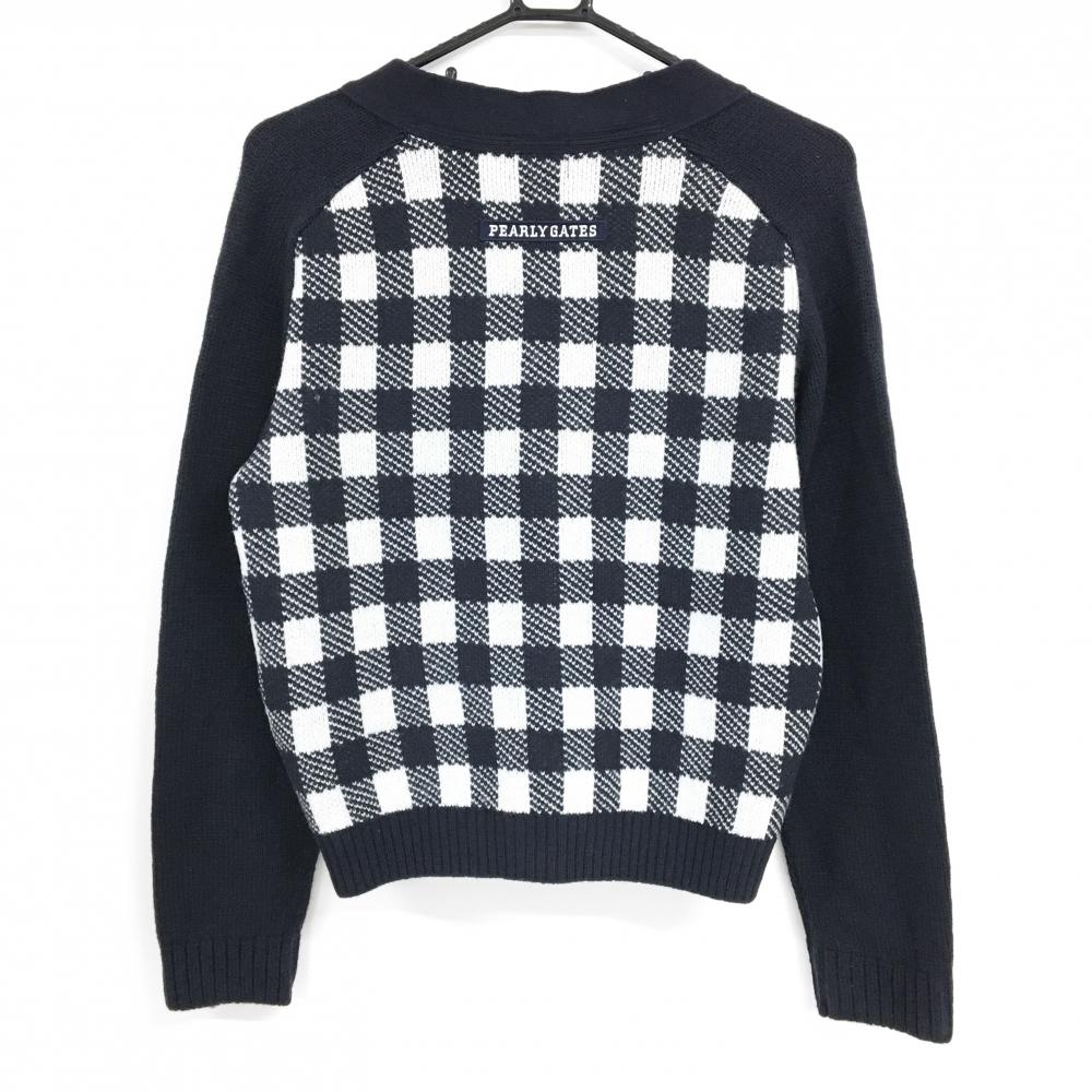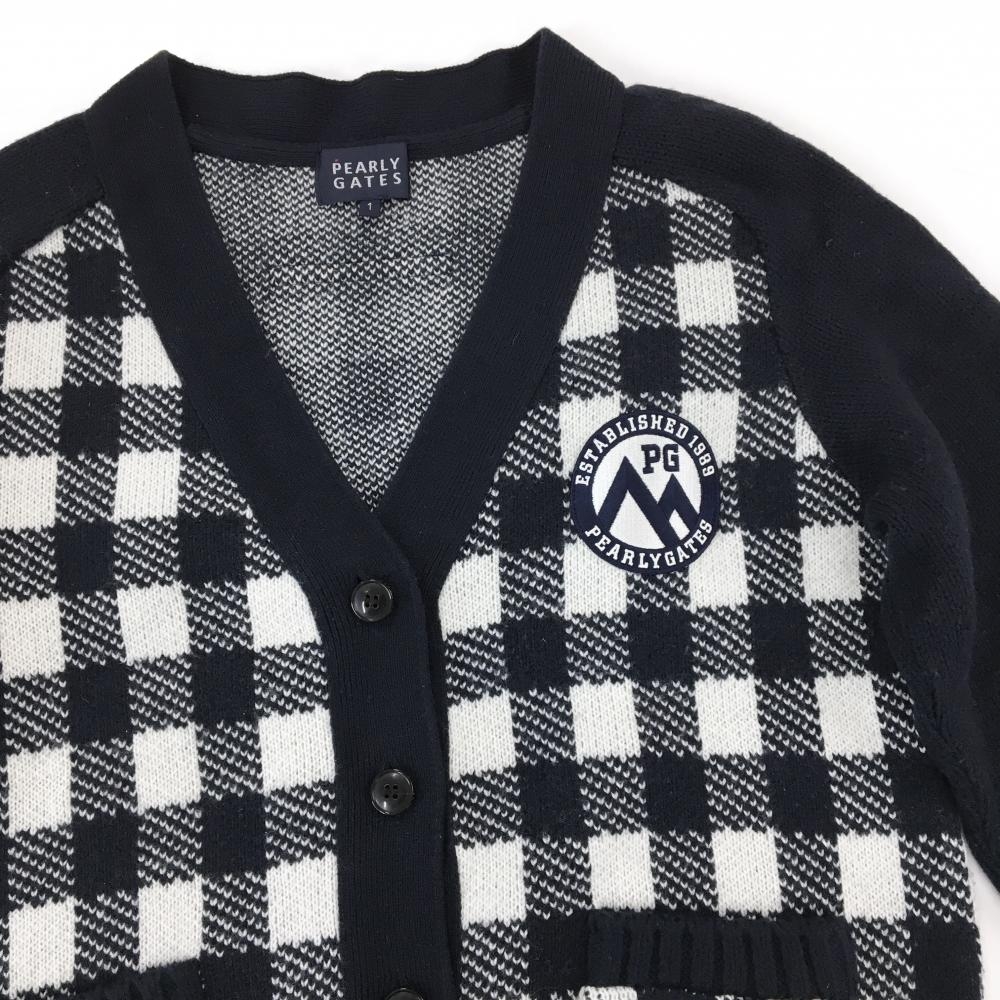 【美品】パーリーゲイツ ニットカーディガン ネイビー×白 身頃チェック ウール混 レディース 1(M) ゴルフウェア PEARLY GATES