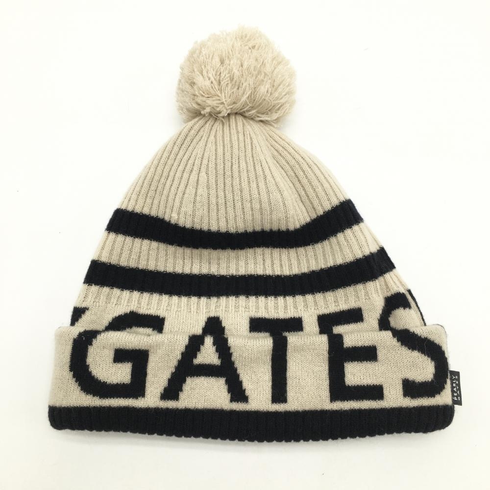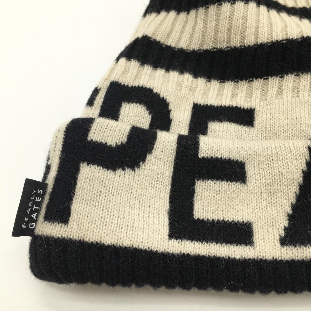 【超美品】パーリーゲイツ ニット帽 ベージュ×黒 ロゴ ライン ボンボン付 FR ゴルフウェア PEARLY GATES