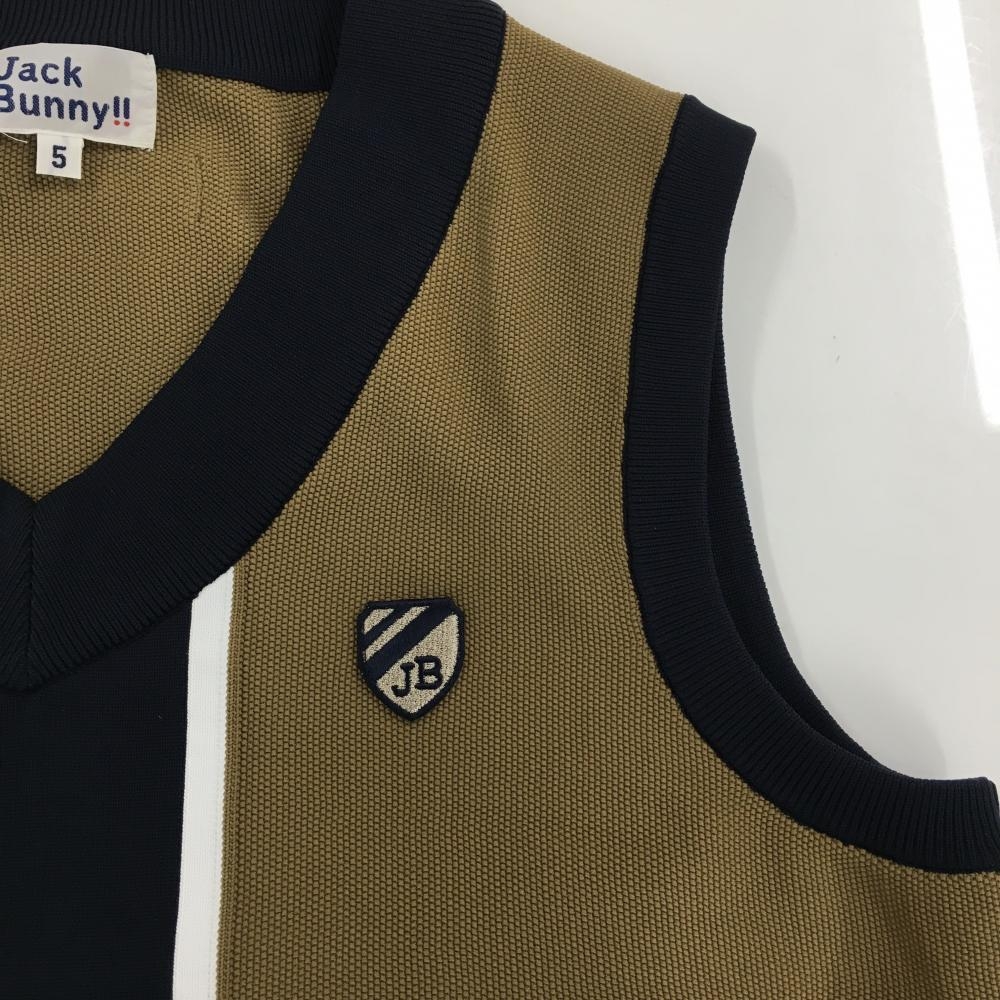 【超美品】ジャックバニー ニットベスト ブラウン×ネイビー フロントライン Vネック ワッペン メンズ 5(L) ゴルフウェア Jack Bunny