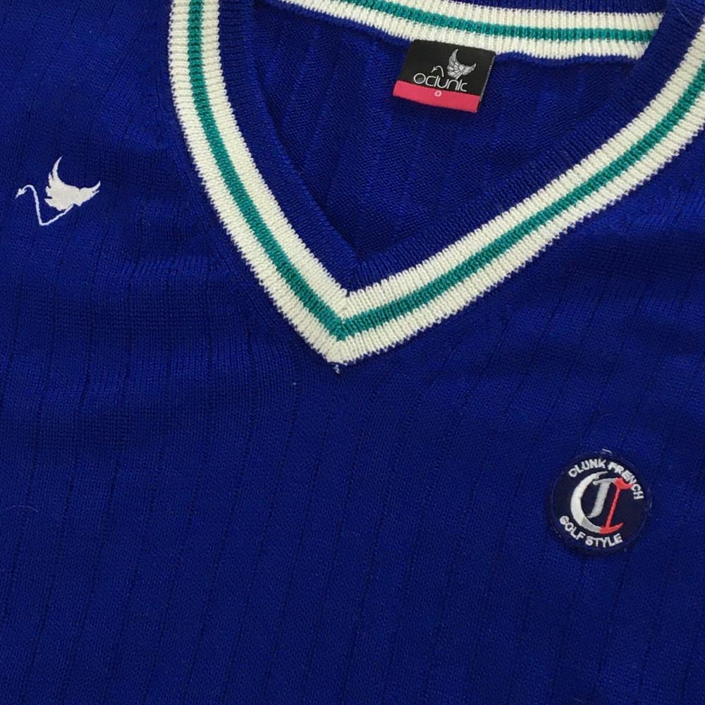 【美品】クランク セーター ブルー×白 Vネック 胸元ワッペン ウール混 ニット メンズ O ゴルフウェア CLUNK