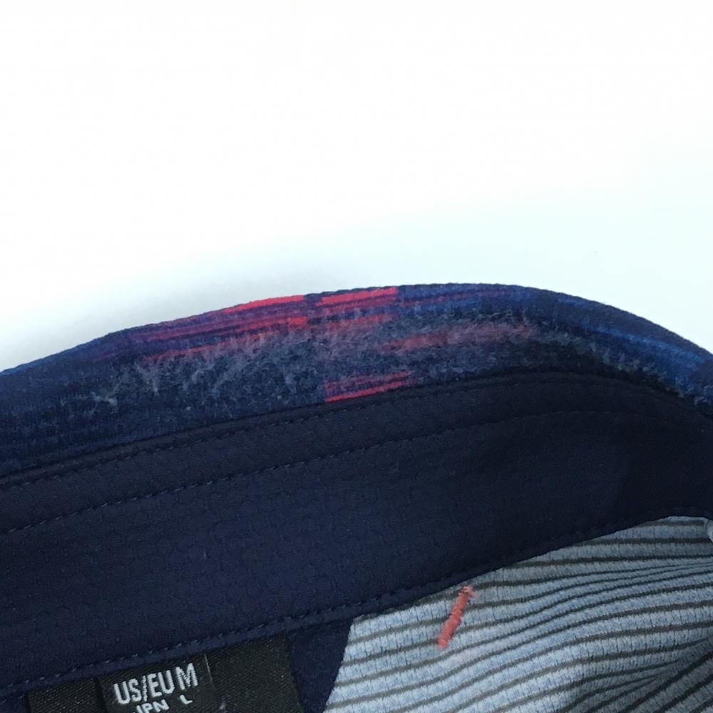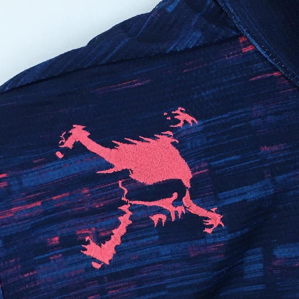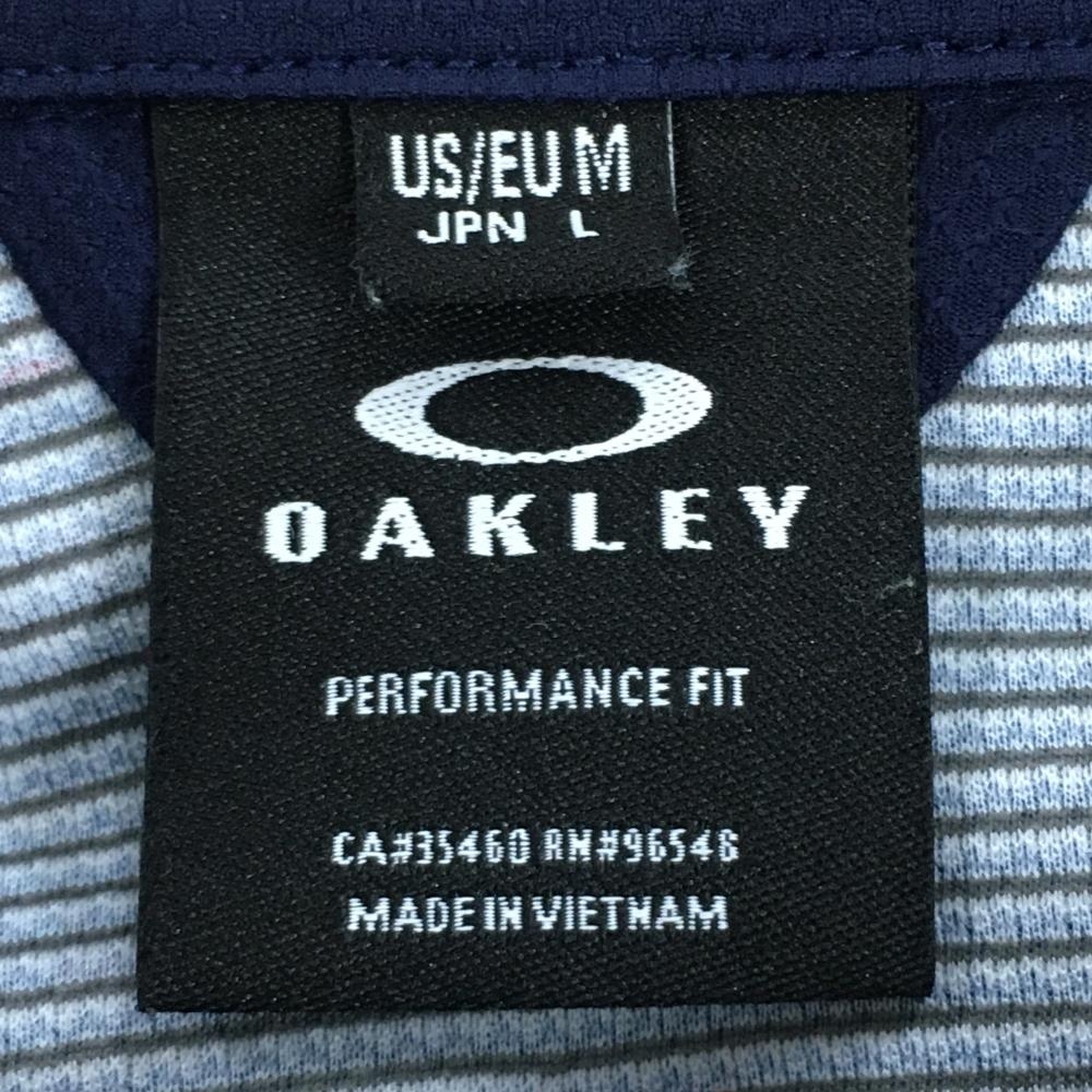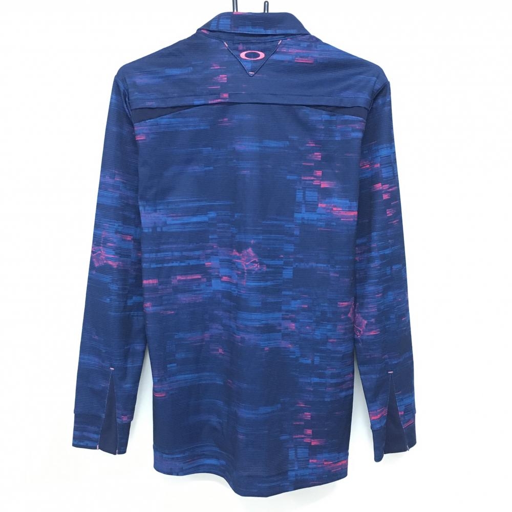 【美品】オークリー 長袖ポロシャツ ネイビー×ピンク 地模様 ロゴ刺しゅう ハーフジップ ボタンダウン メンズ L ゴルフウェア Oakley