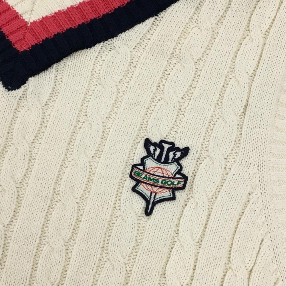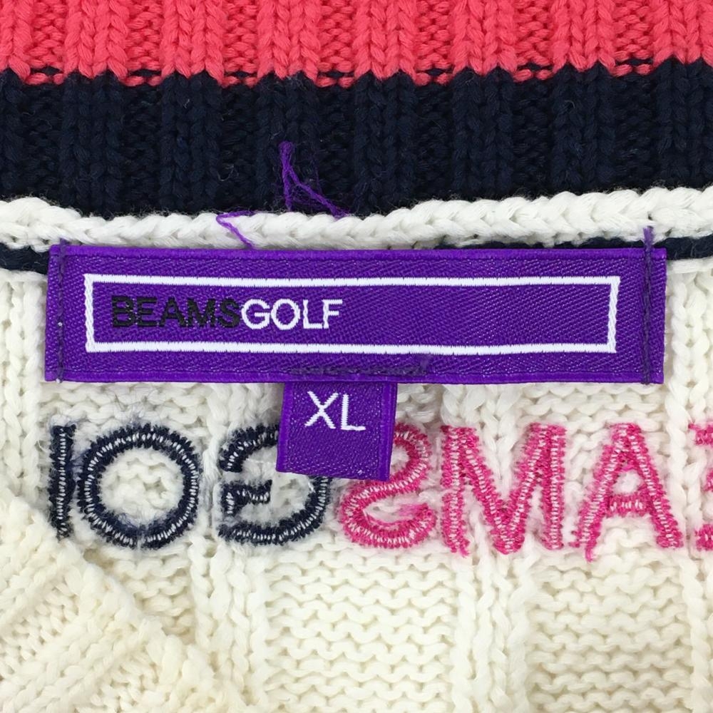 【美品】ビームスゴルフ ニットベスト アイボリー×ピンク×ネイビー ケーブル編み Vネック 綿100% メンズ XL ゴルフウェア BEAMS GOLF
