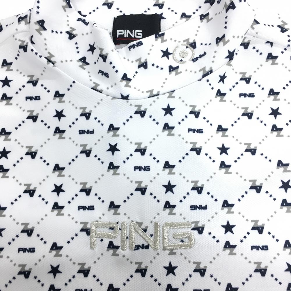 【美品】ピン 長袖ハイネックシャツ 白×ネイビー 総柄 英字 斜め格子調 ロゴ刺しゅう メンズ S ゴルフウェア PING
