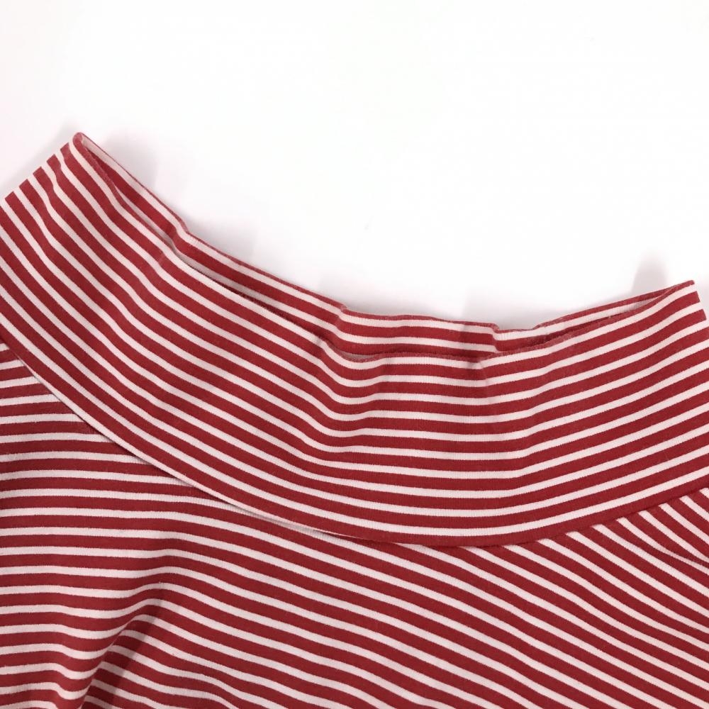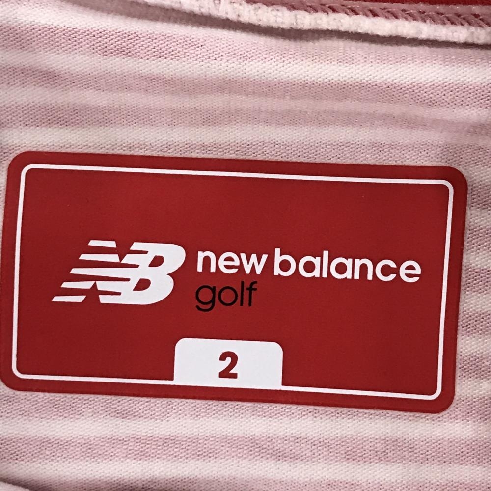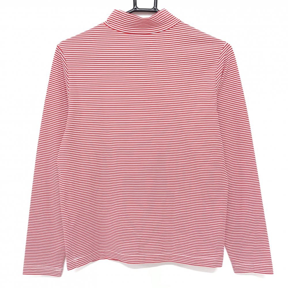 【美品】ニューバランスゴルフ 長袖ハイネックシャツ レッド×白 ボーダー 袖ロゴ レディース 2(L) ゴルフウェア New Balance