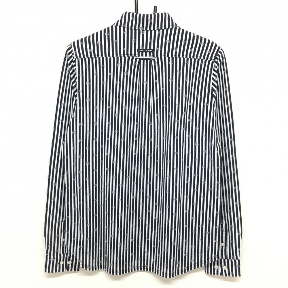 【超美品】パーリーゲイツ 長袖ポロシャツ ネイビー×白 ストライプ ロゴ総柄 レディース 2(L) ゴルフウェア PEARLY GATES