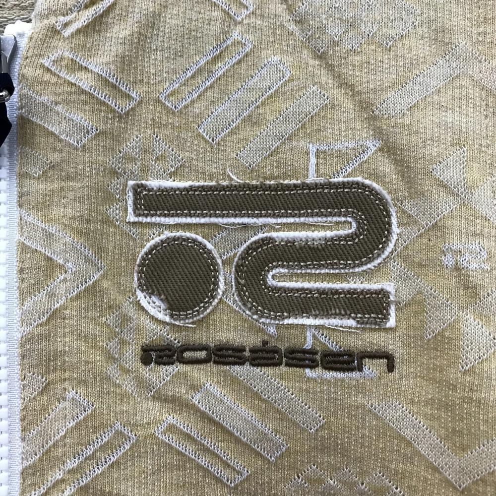 【美品】ロサーセン フード付きベスト ベージュ系×ブラウン 総柄 ロゴダメージ加工 レディース L ゴルフウェア Rosasen