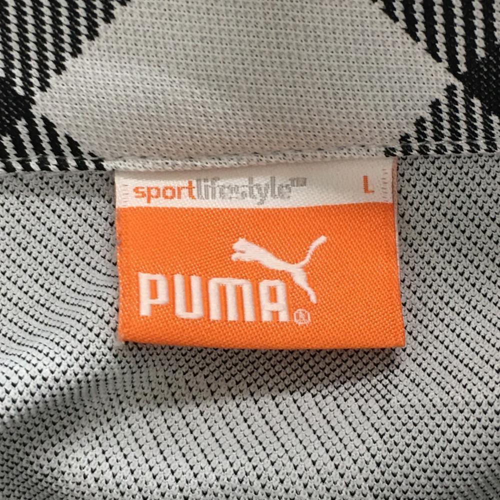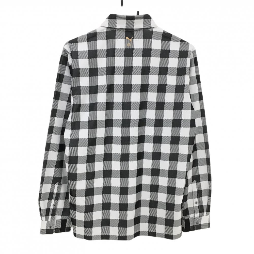 【超美品】プーマ 長袖ポロシャツ 白×黒 チェック ロゴ刺しゅう メンズ L ゴルフウェア PUMA