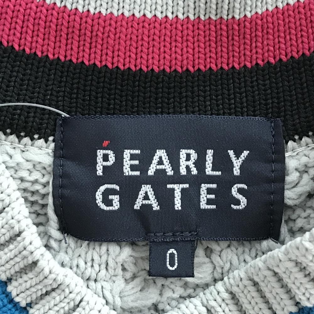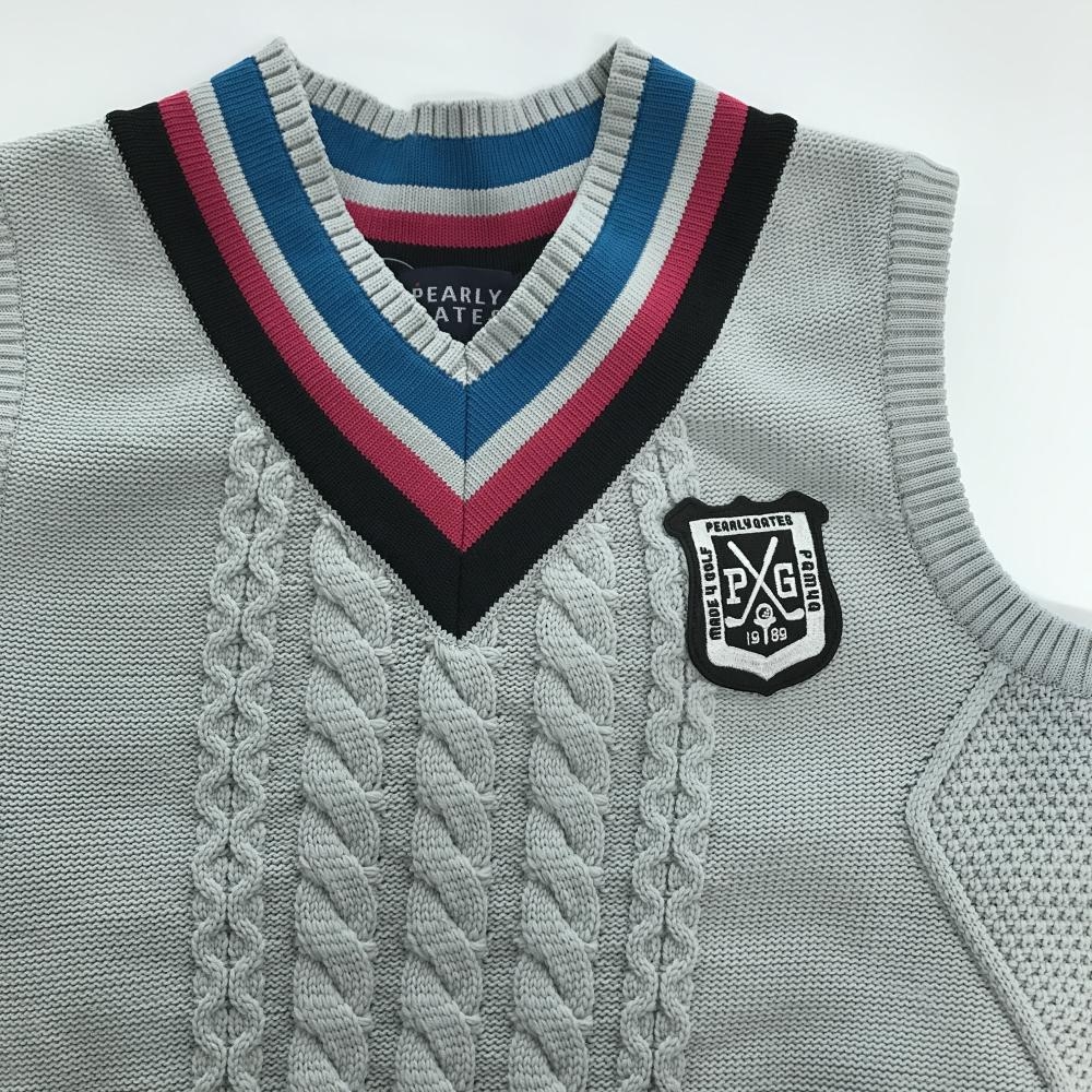 【超美品】パーリーゲイツ ニットベスト ライトグレー×黒×ピンク 一部ケーブル編み Vネック レディース 0(S) ゴルフウェア PEARLY GATES