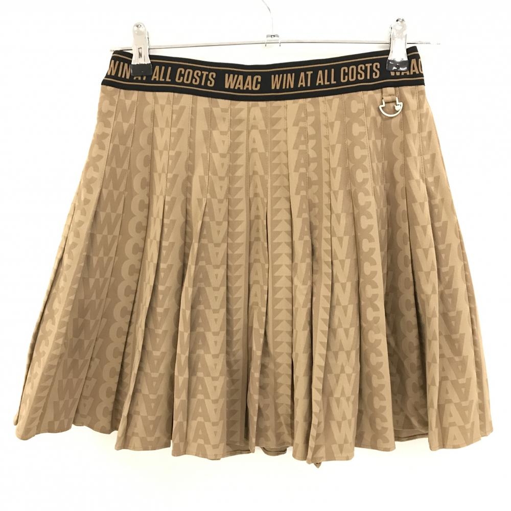 【超美品】ワック プリーツスカート ライトブラウン 英字総柄 ウエストゴム 内側インナーパンツ レディース 0(XS) ゴルフウェア WAAC