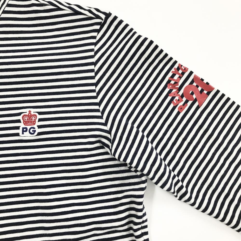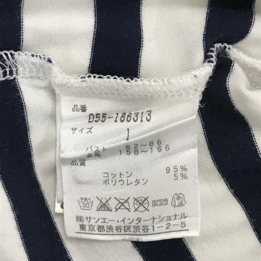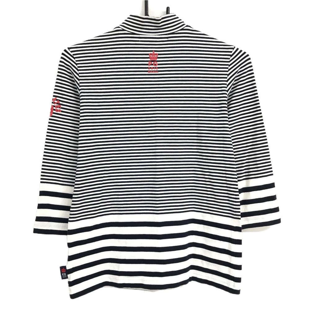 【美品】パーリーゲイツ 七分袖ハイネックシャツ ネイビー×白 ボーダー ストレッチ レディース 1(M) ゴルフウェア PEARLY GATES