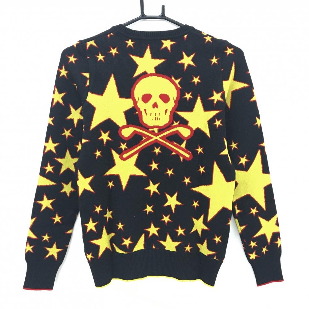 【超美品】マークアンドロナ セーター 黒×イエロー 星総柄 Vネック ラメ ニット スカル レディース S ゴルフウェア MARK&LONA