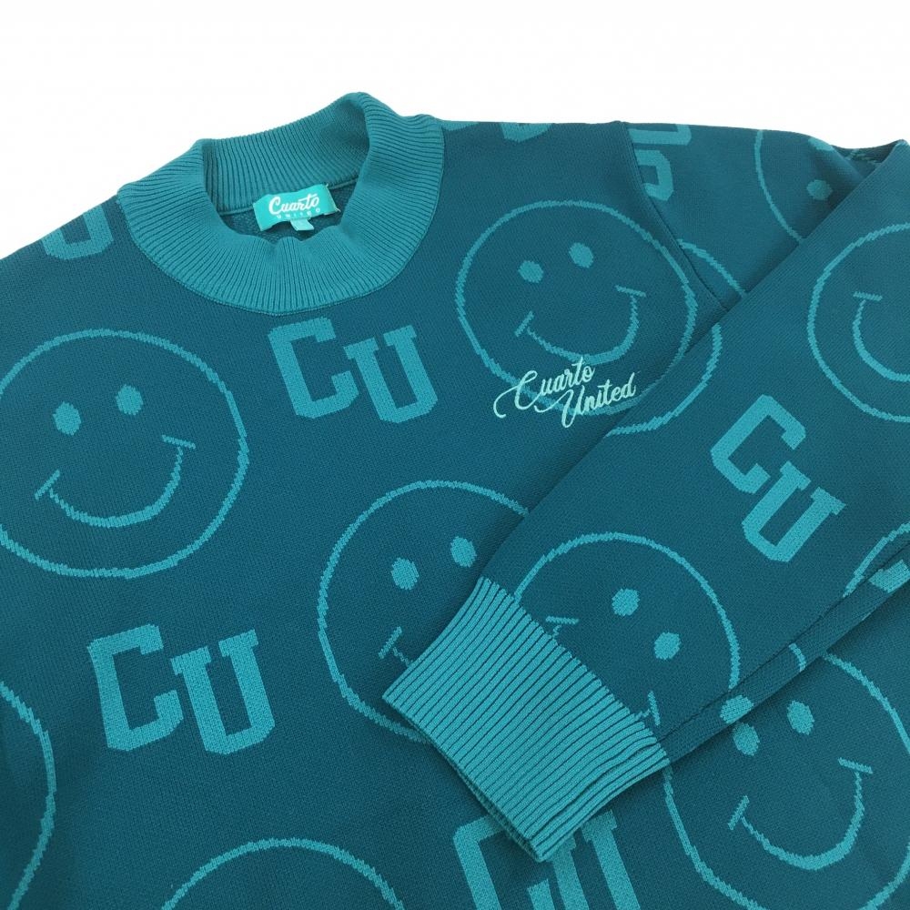 【超美品】クアルトユナイテッド ハイネックセーター グリーン ニコちゃん総柄 ロゴ刺しゅう レディース L ゴルフウェア CUARTO UNITED