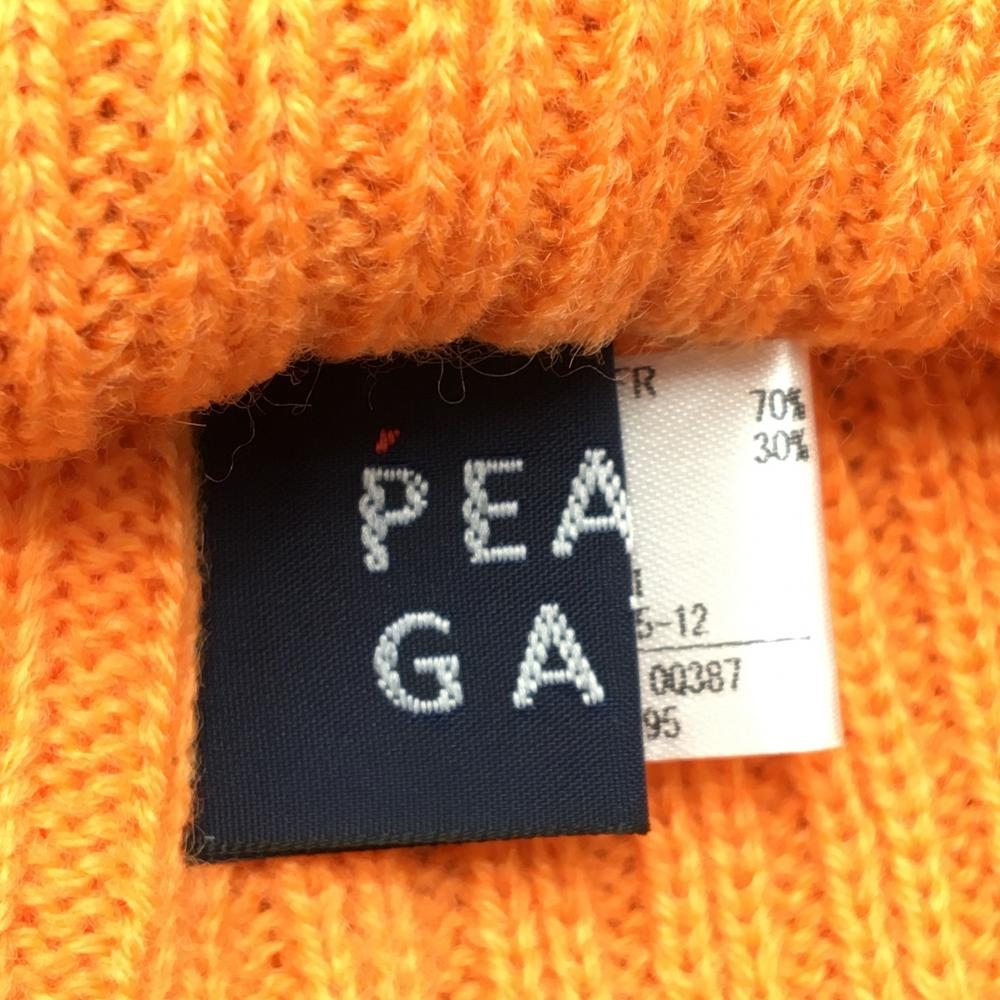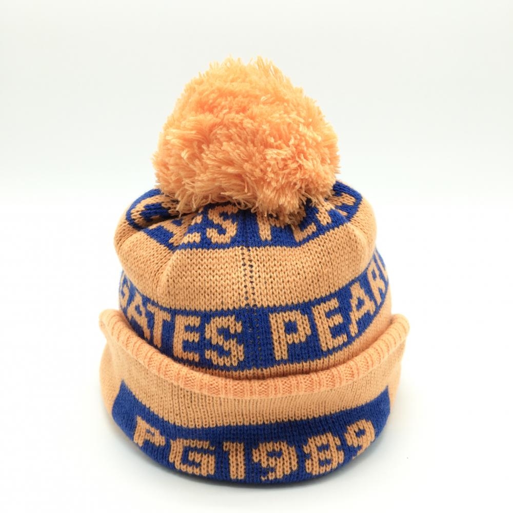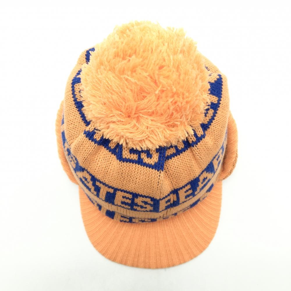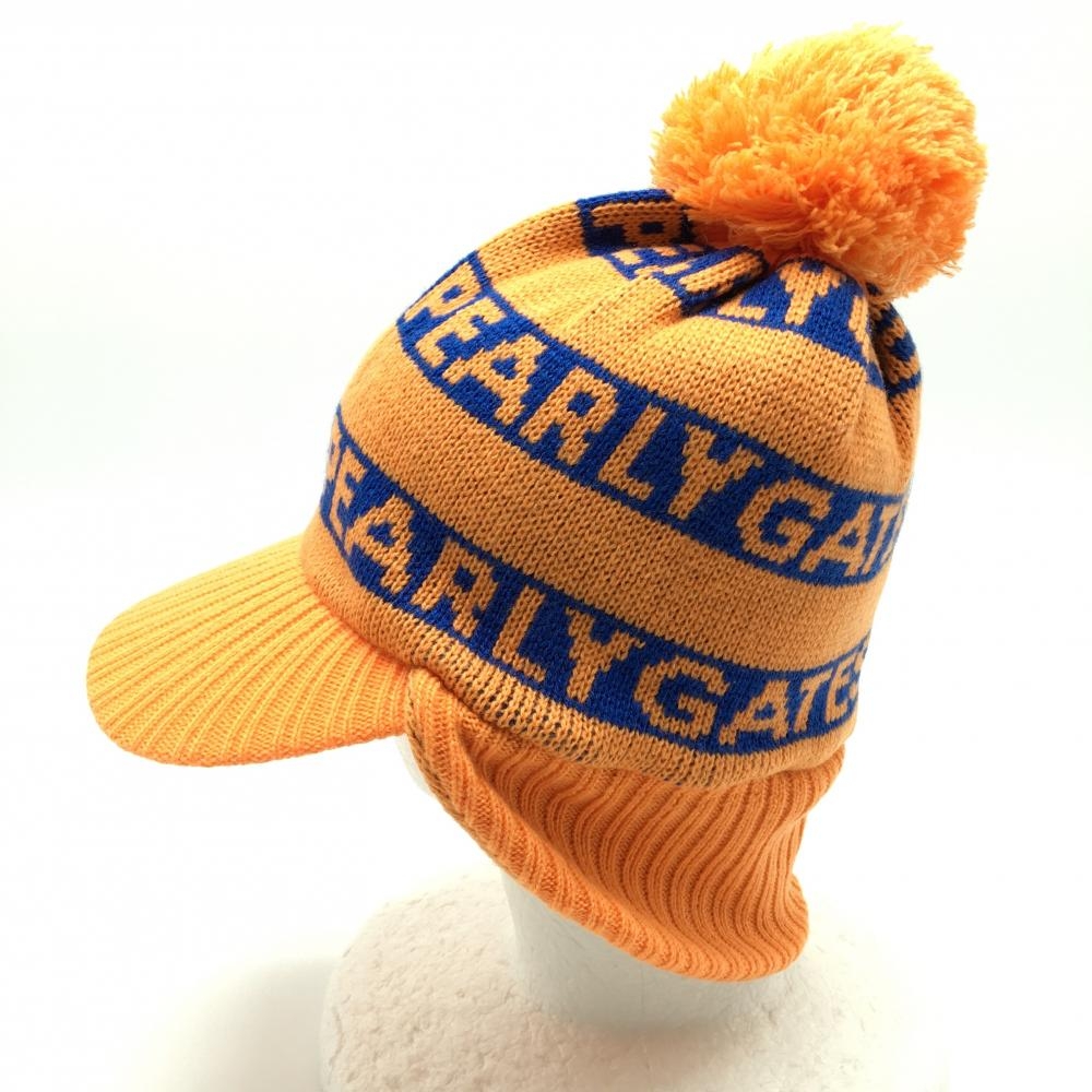 【超美品】パーリーゲイツ つば付ニット帽 オレンジ×ブルー ウール混 耳当て付 ボンボン付 FR ゴルフウェア PEARLY GATES