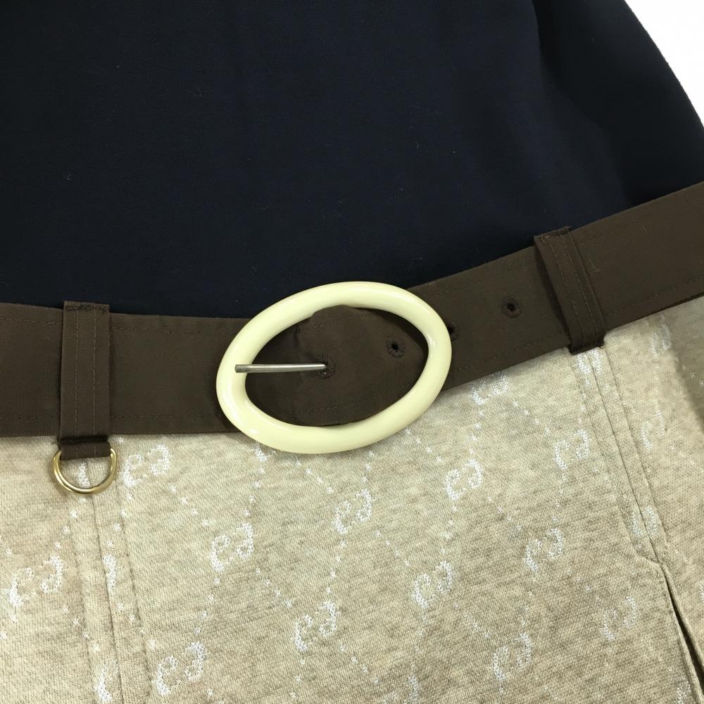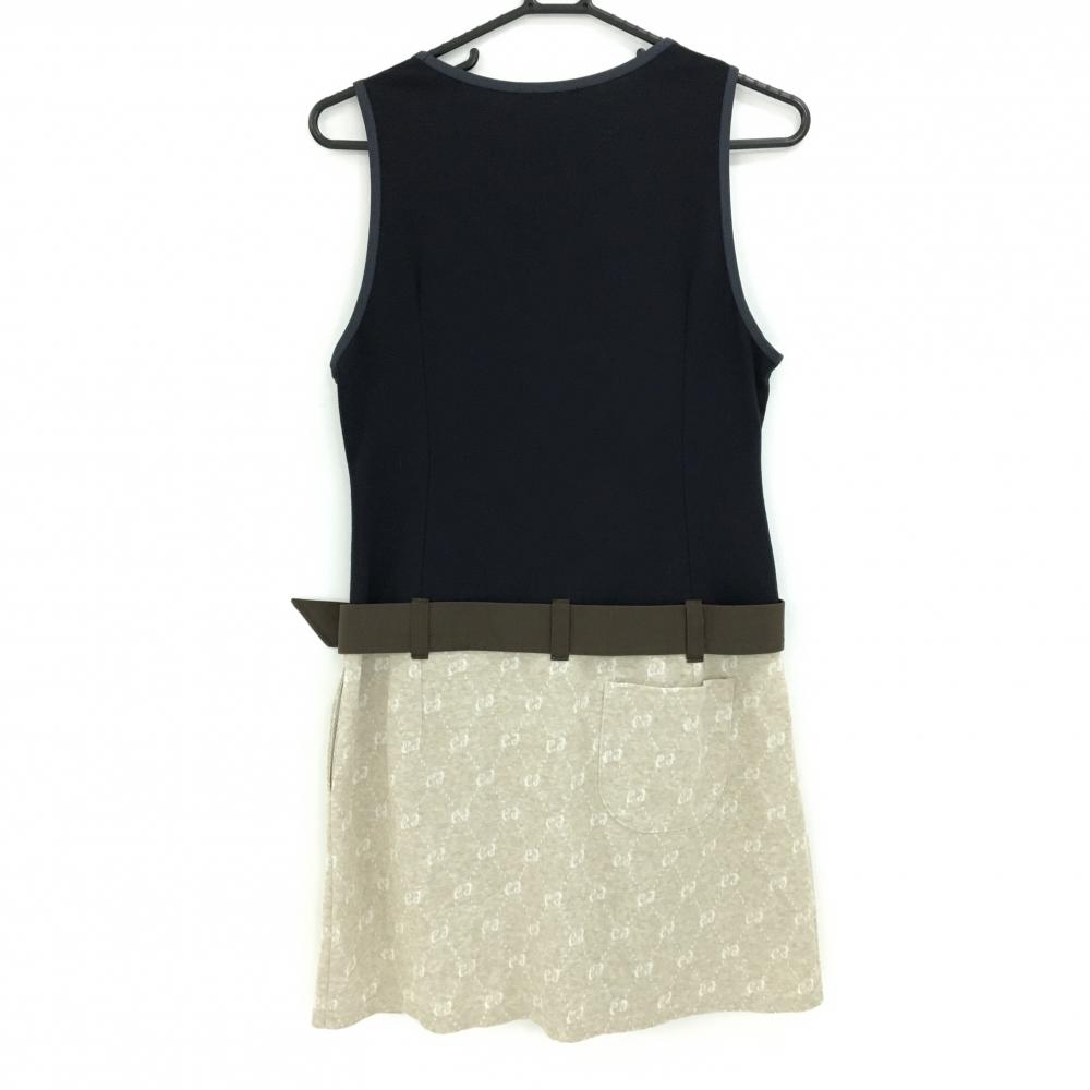 【超美品】エフィカス ノースリーブワンピース ネイビー×ベージュ スカートロゴ総柄 ベルト付 レディース 2(M) ゴルフウェア efficace
