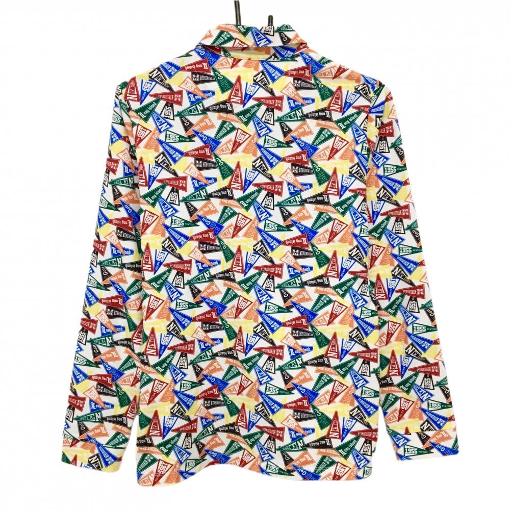 【美品】マンシングウェア 長袖ポロシャツ 白×マルチカラー フラッグ総柄 レディース L ゴルフウェア Munsingwear
