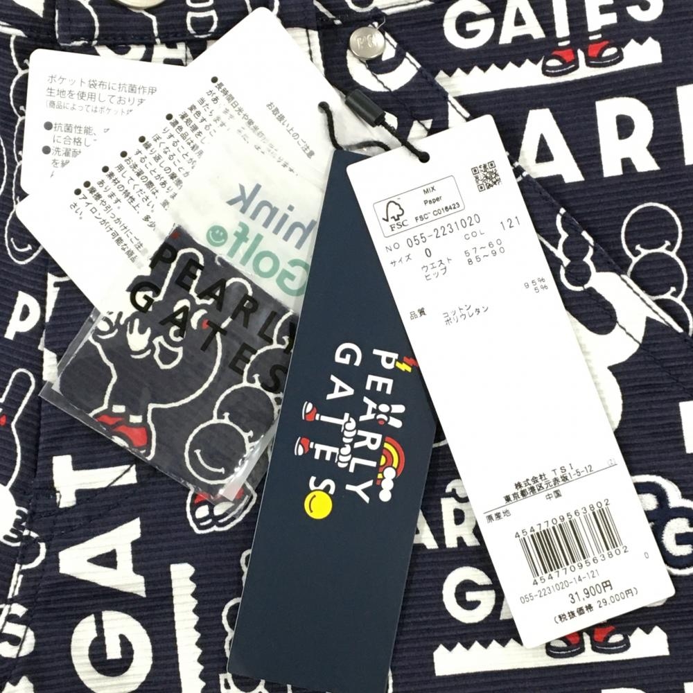 【新品】パーリーゲイツ パンツ ネイビー×白 ロゴ総柄 どうしちゃったPG ボーダー織生地 レディース 0(S) ゴルフウェア PEARLY GATES