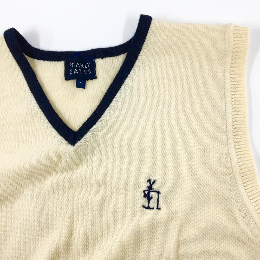【美品】パーリーゲイツ ニットベスト 白×ネイビー ウール100% Vネック レディース 1(M) ゴルフウェア PEARLY GATES