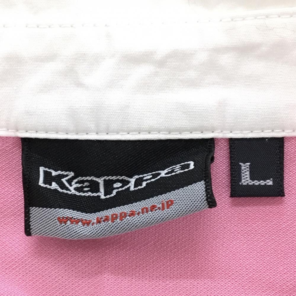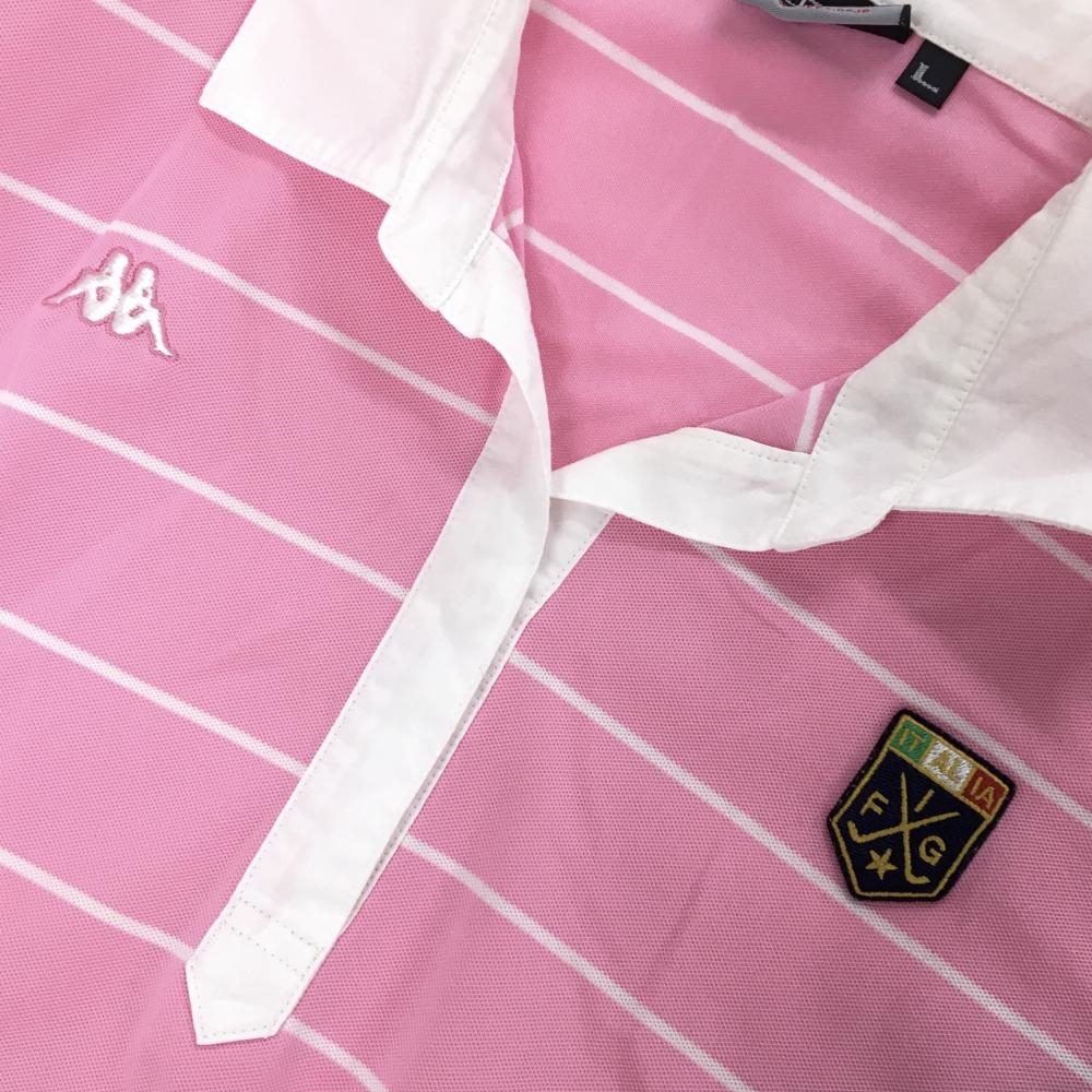 【美品】カッパ 長袖スキッパーシャツ ピンク×白 ボーダー ロゴ刺しゅう レディース L ゴルフウェア Kappa