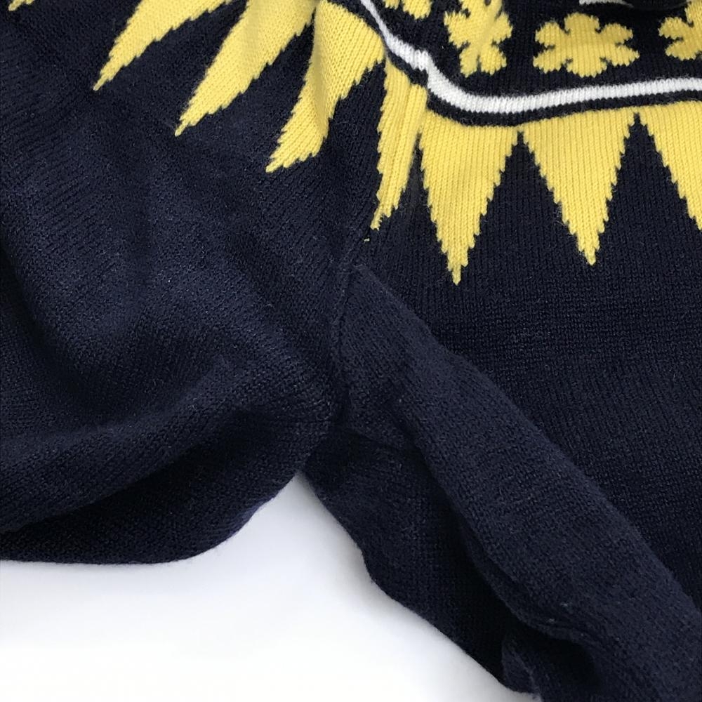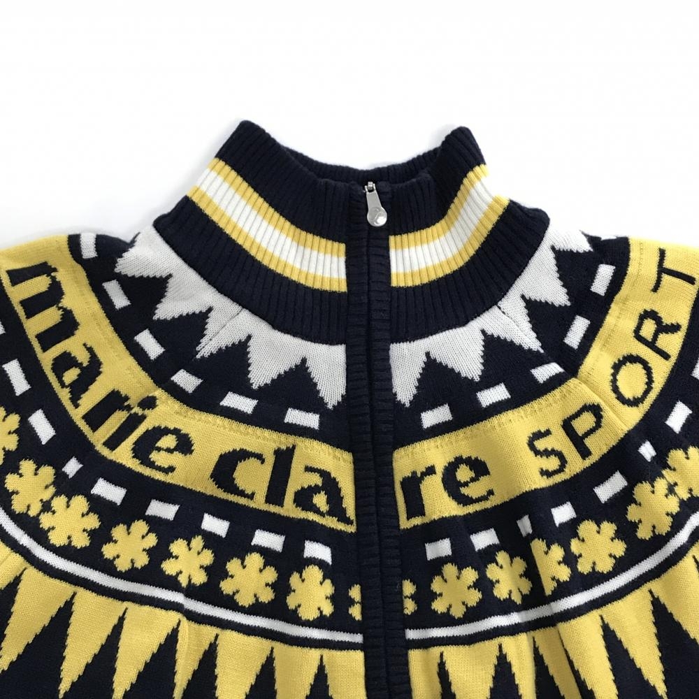 【美品】マリクレールスポール ニットジャケット ダークネイビー×イエロー 花柄 裏地付き レディース L ゴルフウェア marie claire