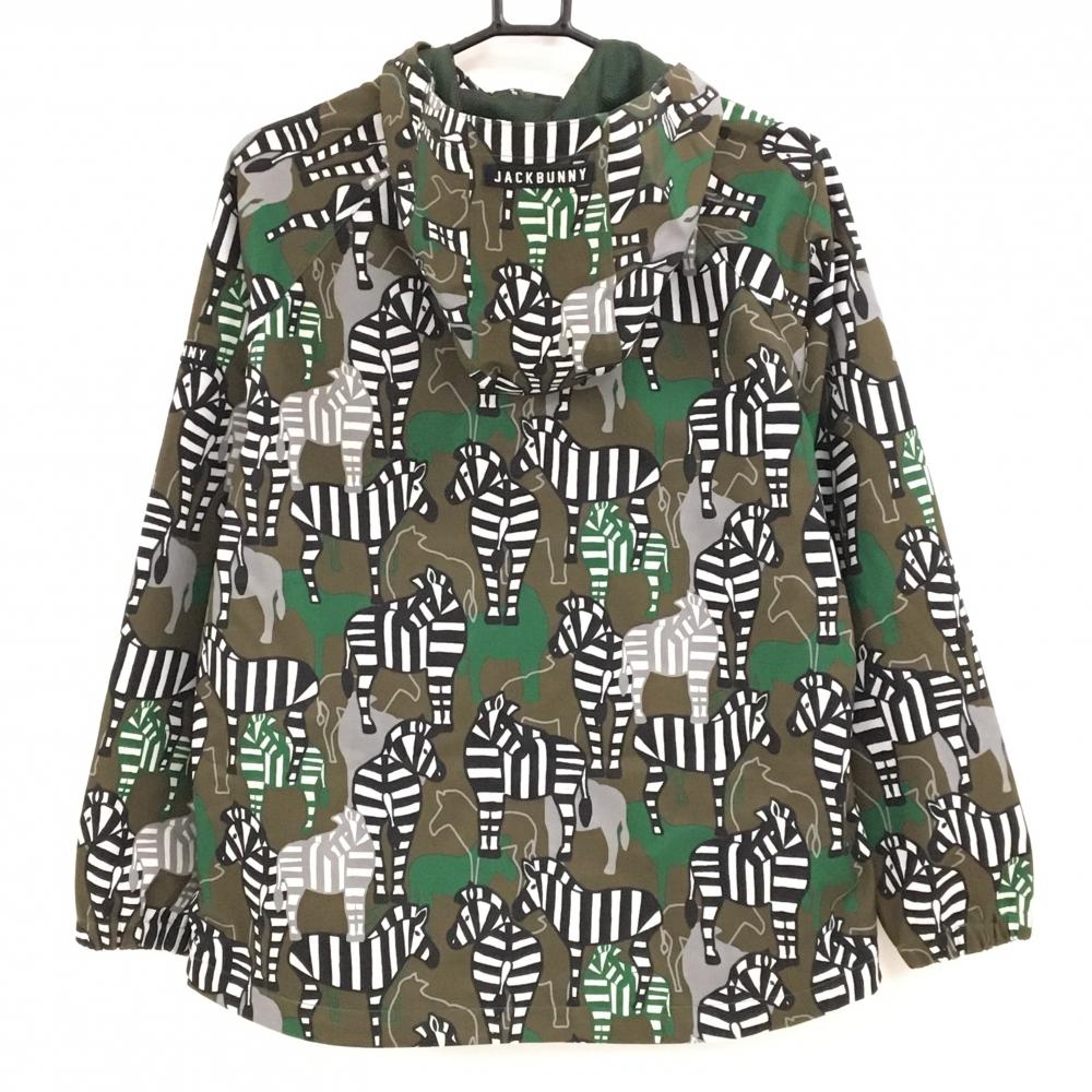 【美品】ジャックバニー ジップパーカー カーキ×白×黒 シマウマ柄 ロゴワッペン 裏地メッシュ レディース 1(M) ゴルフウェア Jack Bunny