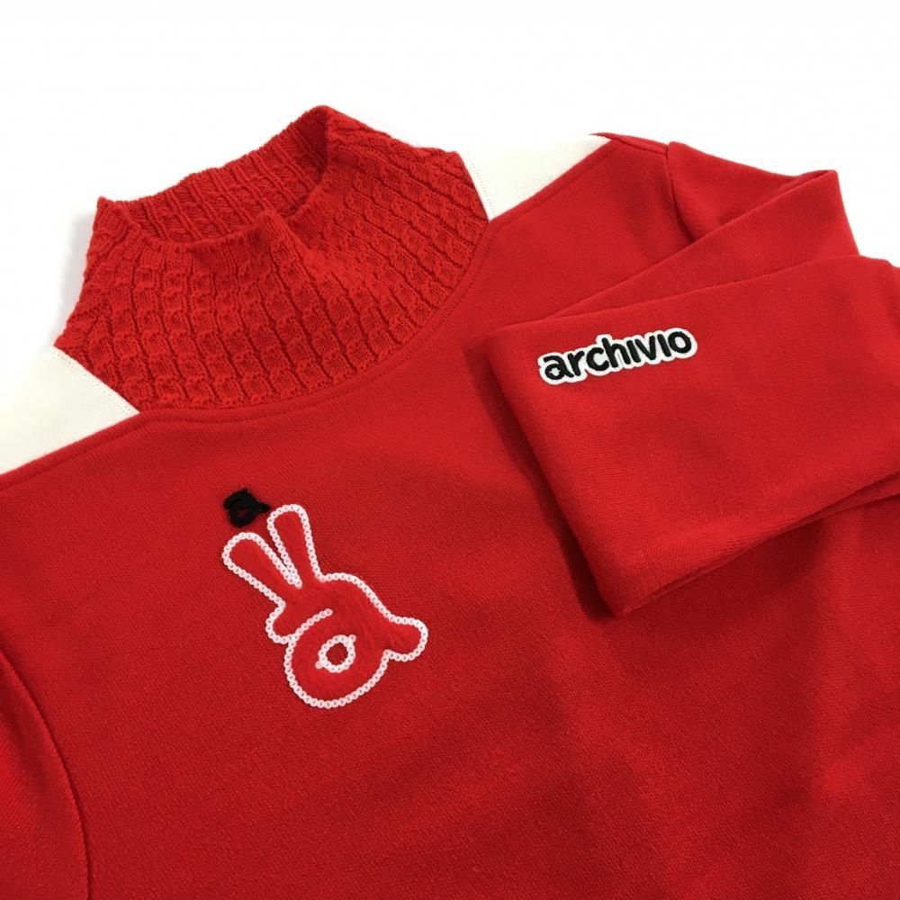【超美品】アルチビオ 長袖ハイネックシャツ レッド ネックケーブル編み レディース 38(M) ゴルフウェア archivio