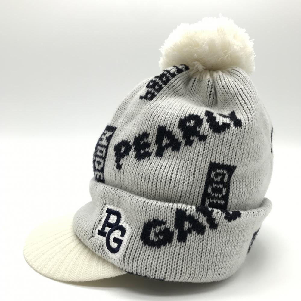 【新品】パーリーゲイツ つば付ニット帽 白×黒 ロゴ総柄 ボンボン付 日本製 FR ゴルフウェア PEARLY GATES