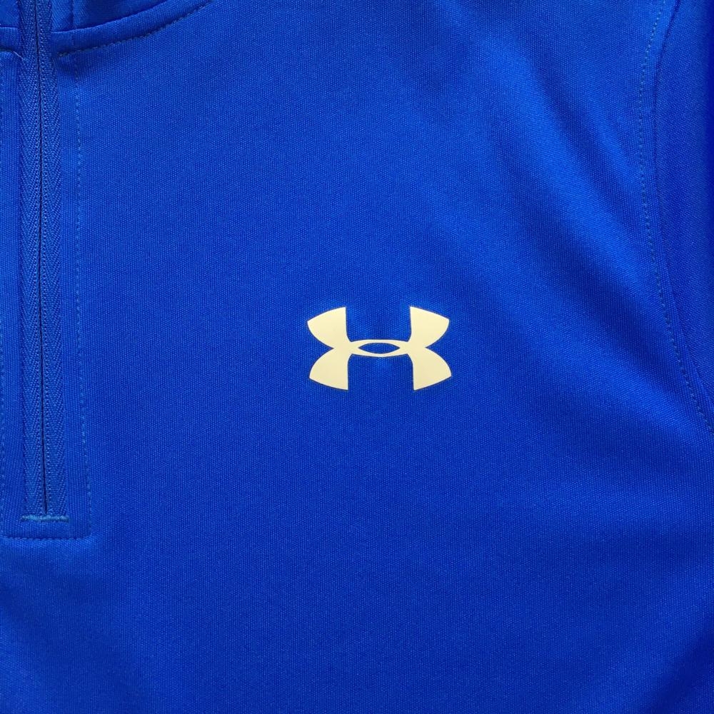 【超美品】アンダーアーマー 長袖ハイネックシャツ ブルー ヒートギア ハーフジップ ロゴプリント メンズ SM ゴルフウェア UNDER ARMOUR
