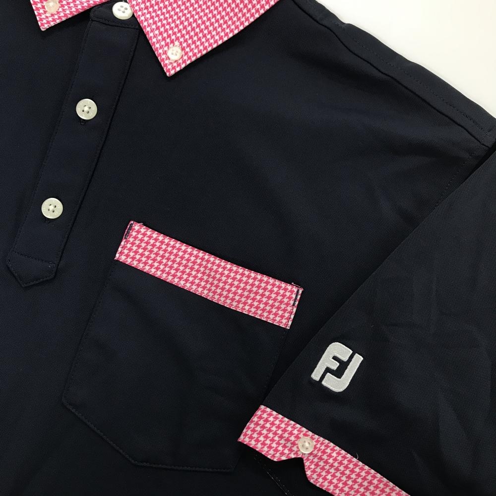 フットジョイ 半袖ポロシャツ ネイビー×ピンク 襟・ポケット千鳥格子 ボタンダウン メンズ XL ゴルフウェア FootJoy