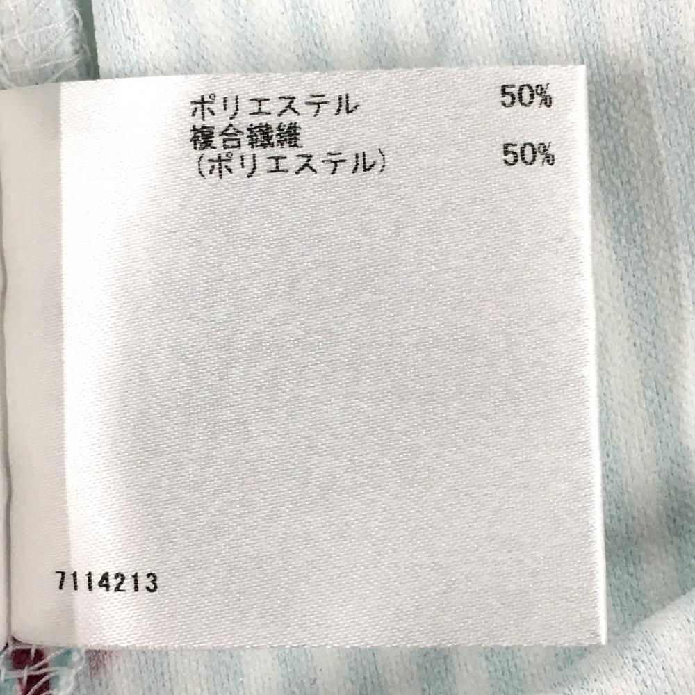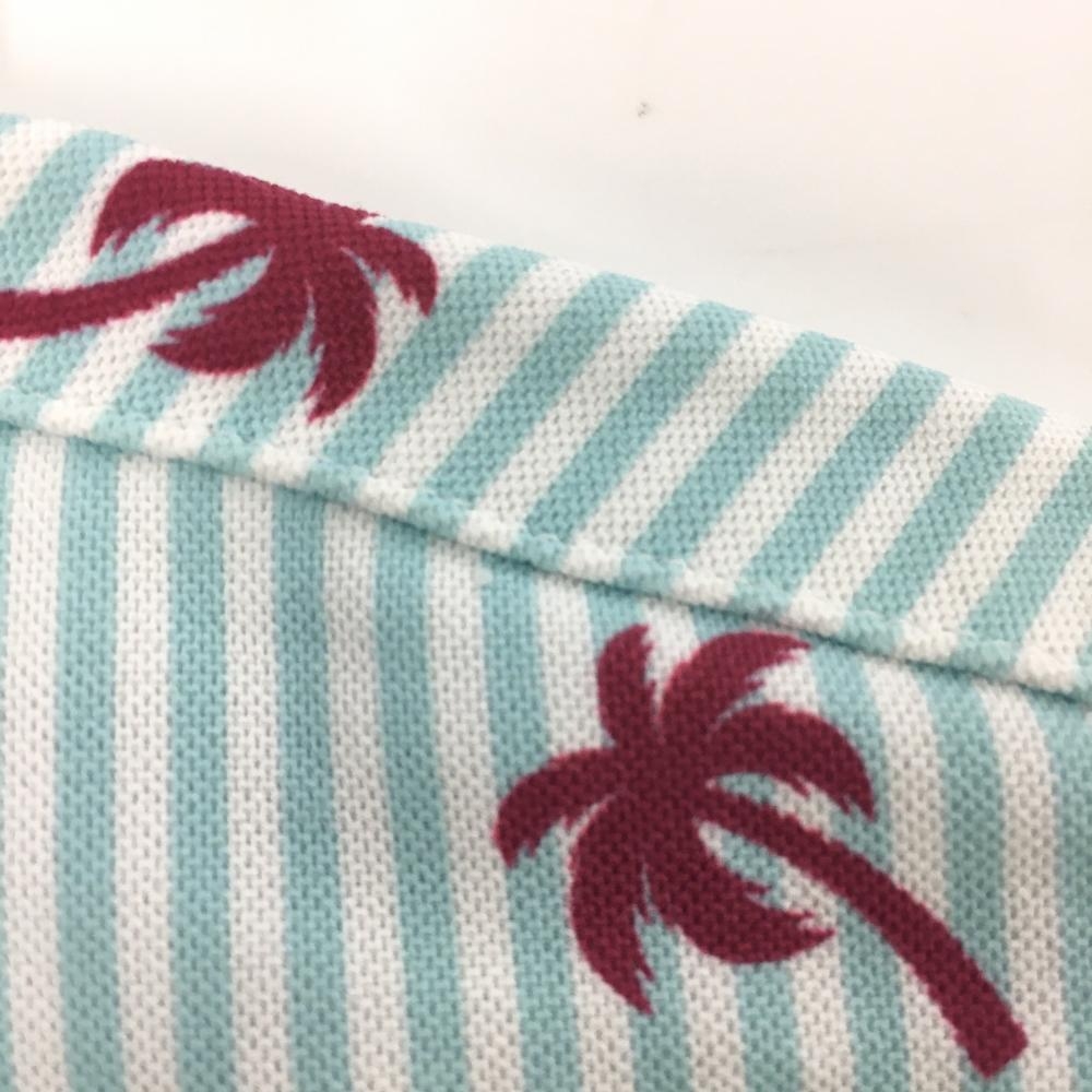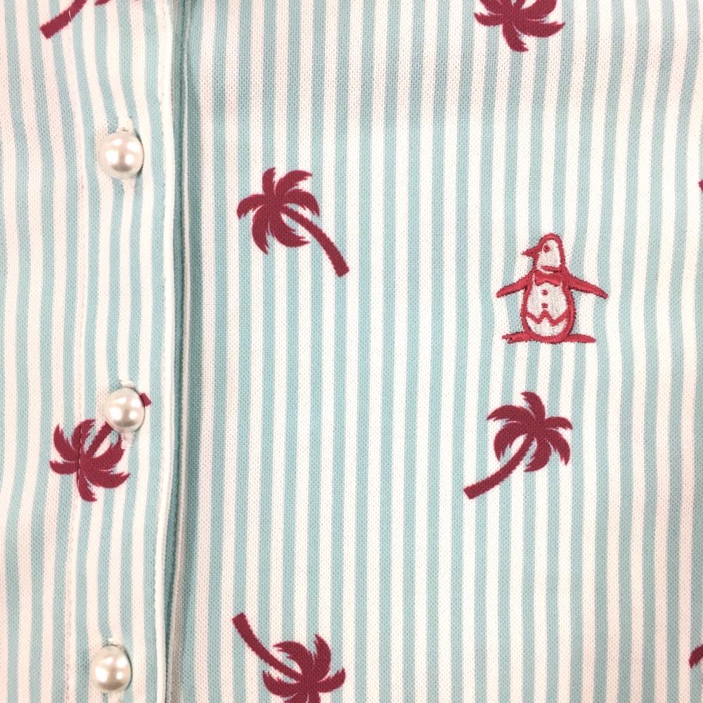 【美品】マンシングウェア 半袖ポロシャツ 白×ライトブルー ストライプ ヤシの木柄 袖フリル レディース L ゴルフウェア Munsingwear