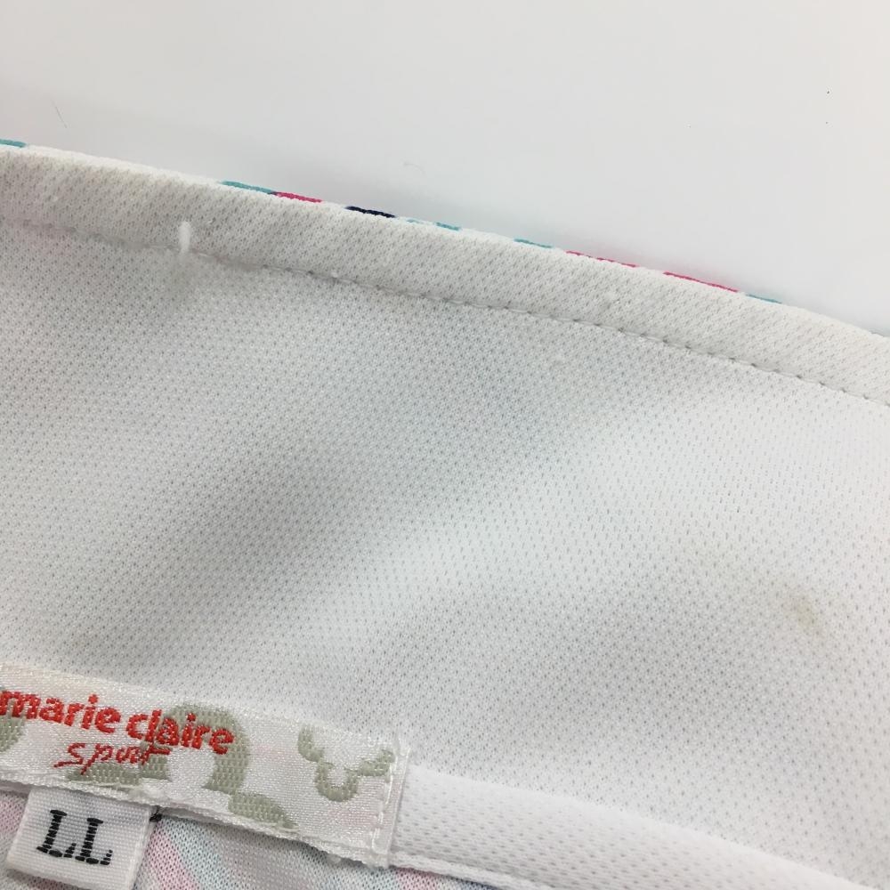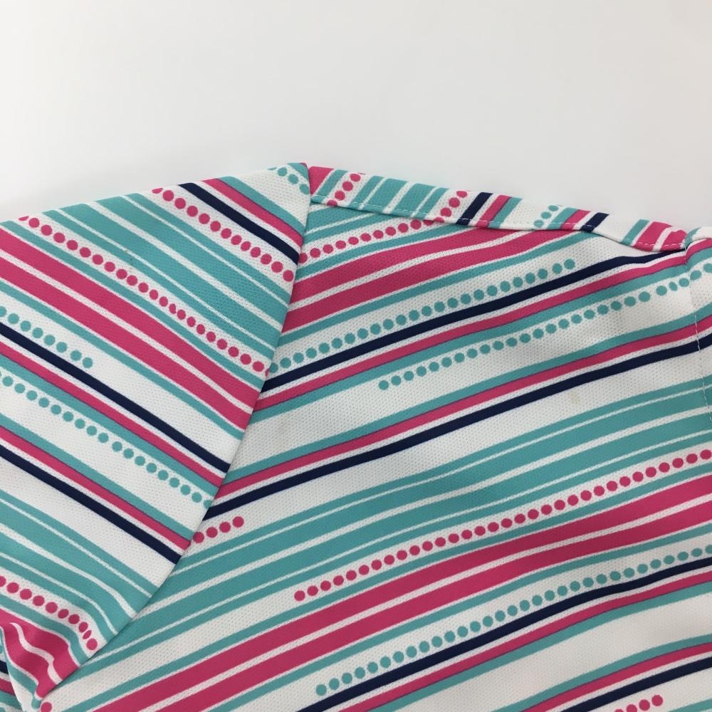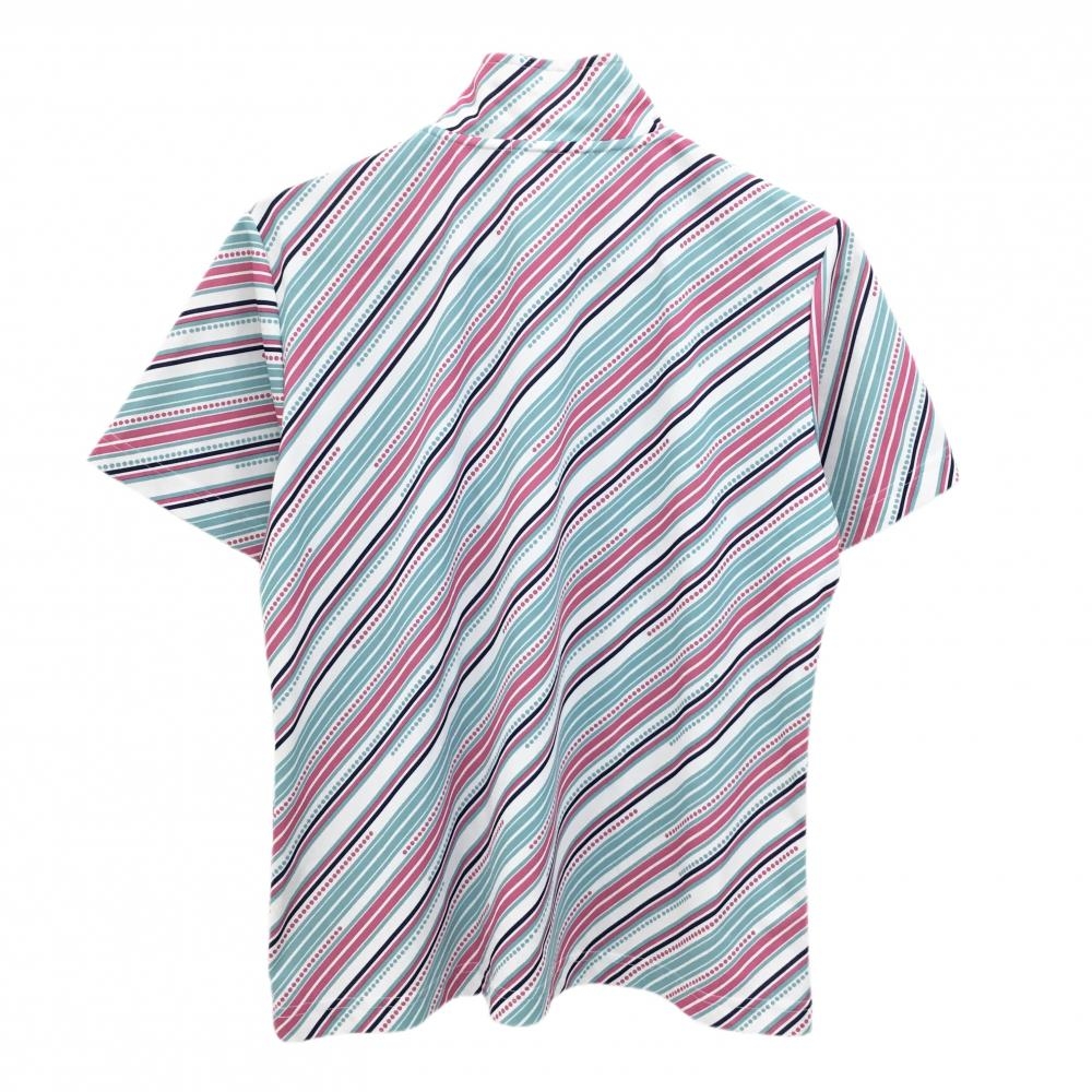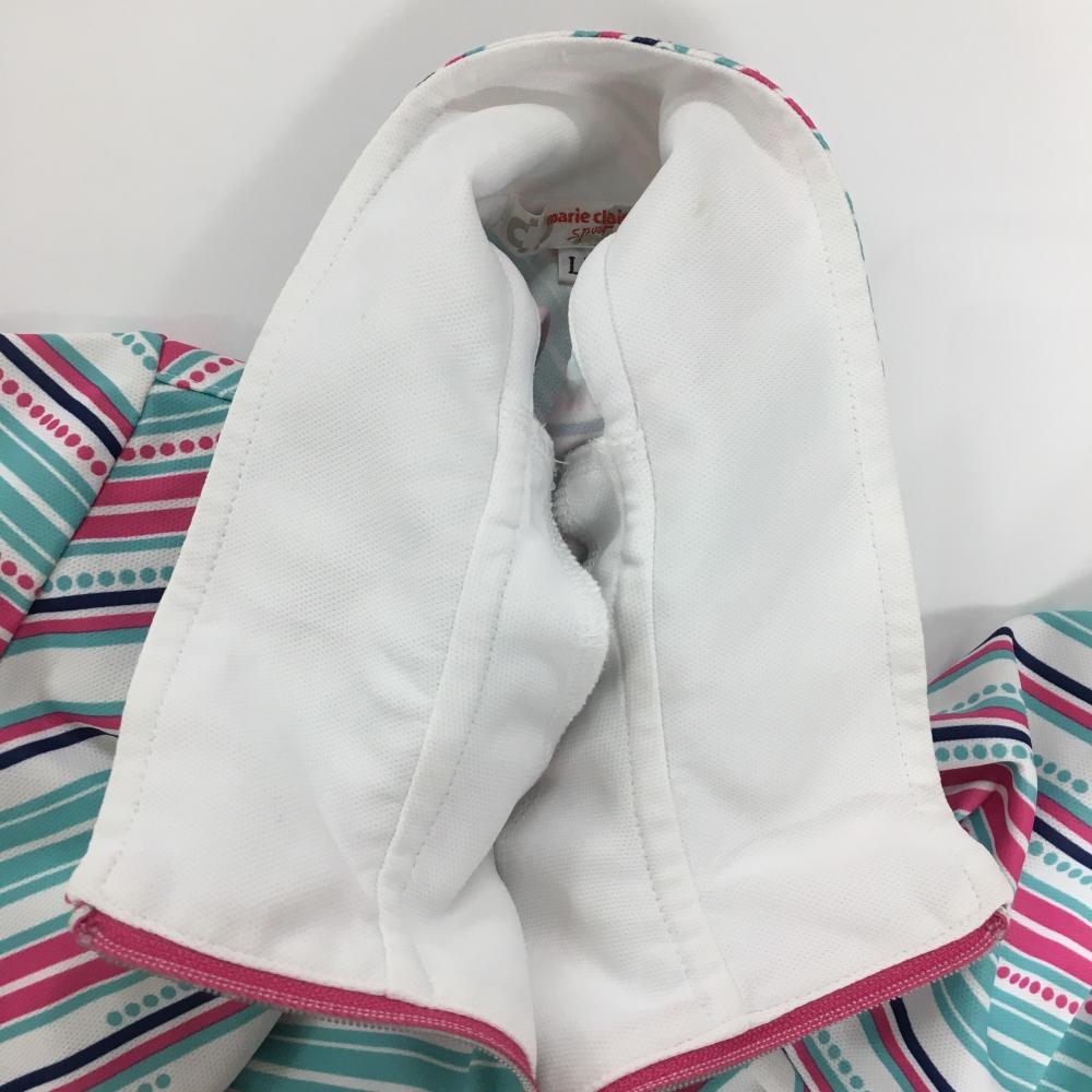 【美品】マリクレールスポール 半袖ハイネックシャツ ミントブルー×ピンク 斜めストライプ レディース LL ゴルフウェア marie claire